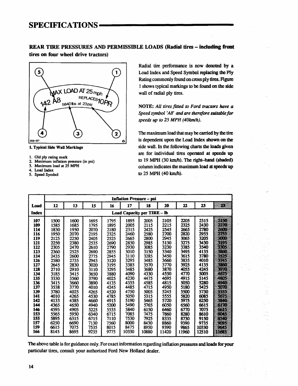 PRESSURES AND PERMISSIBLE LOADS (Radial tires - inducting front