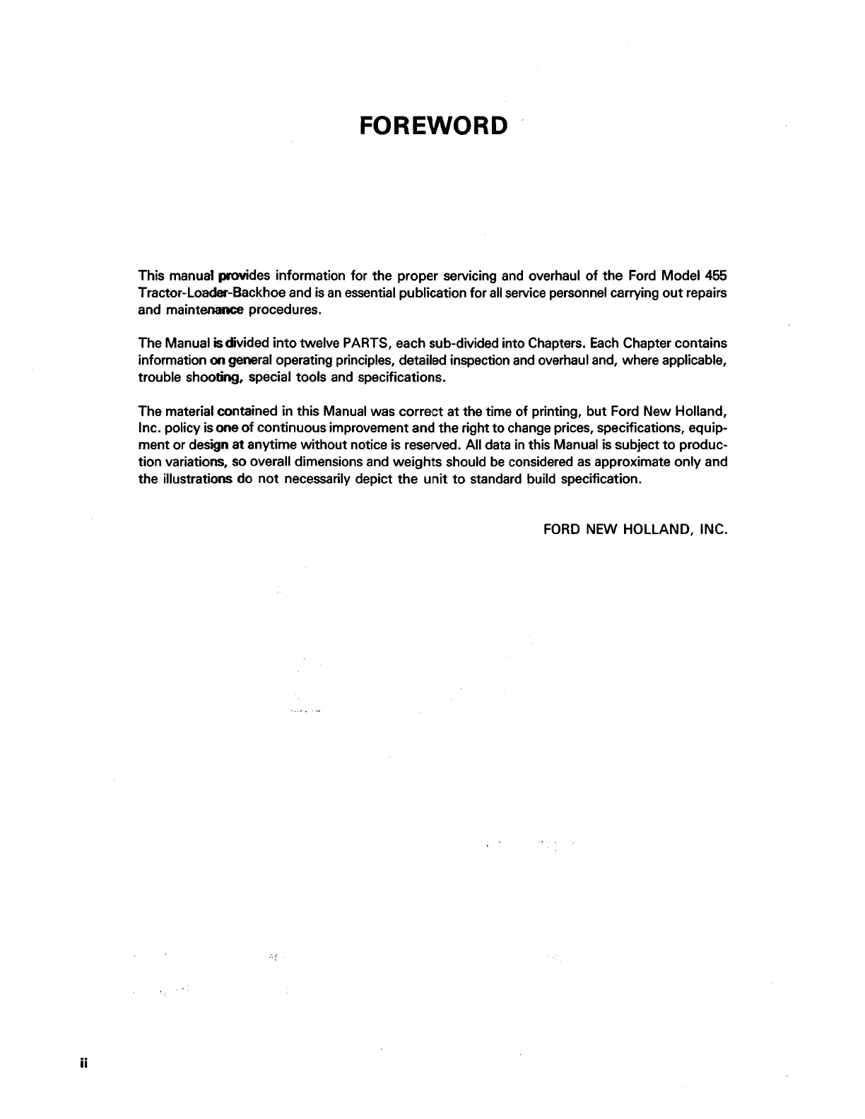 This manual provides information for the proper servicing and overhaul of the Ford Model 455