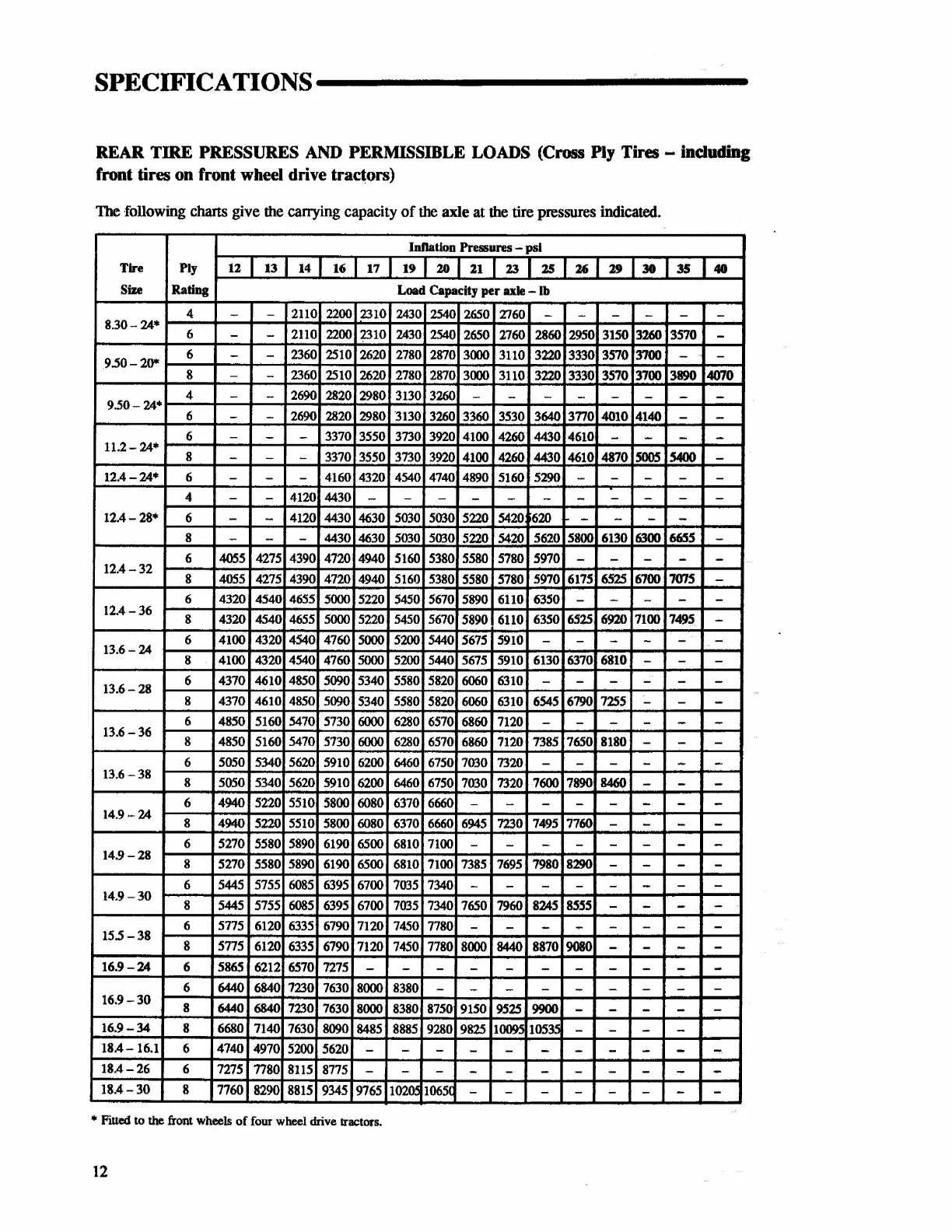 Ford 4630 - Rear Tire Pressures and Loads (Cross Ply); Cross Ply Rear Tire Load Capacity