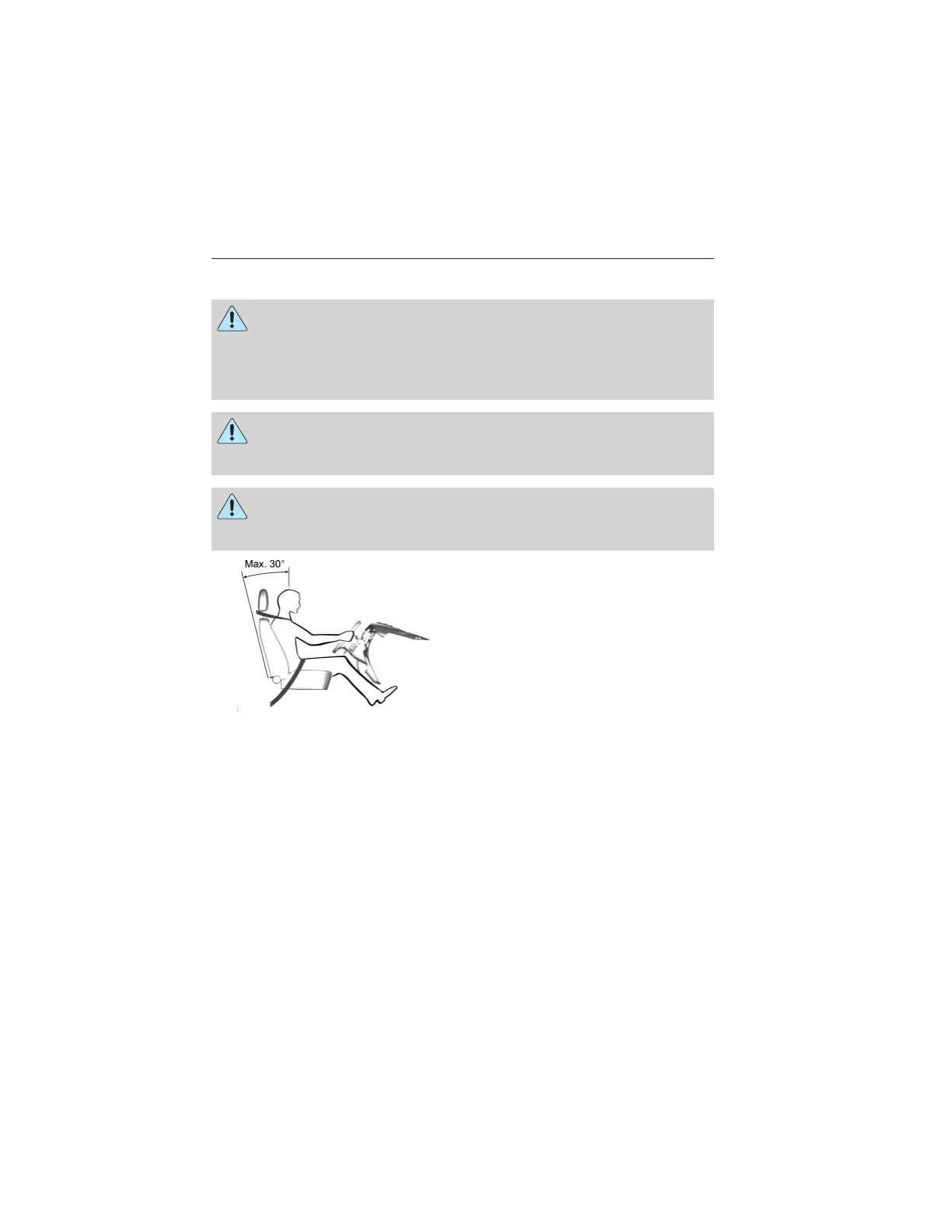 • Do not recline the seatback more than 30 degrees from vertical.