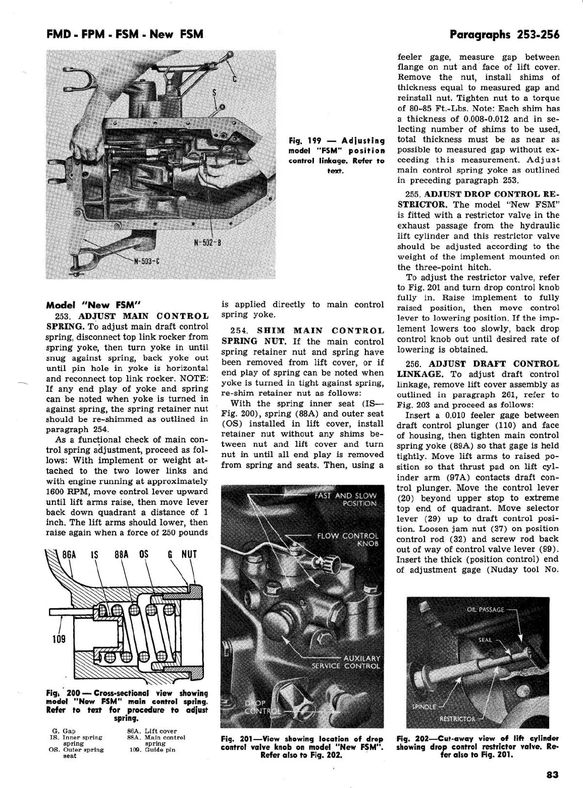 Ford new performance super dexta - Model New FSM System Adjustments; Adjusting Model FSM Position Control Linkage Illustration; View Showing Location of Drop Control Valve Knob on Model New FSM; Cut-Away View of Lift Cylinder Showing Drop Control Restrictor Valve