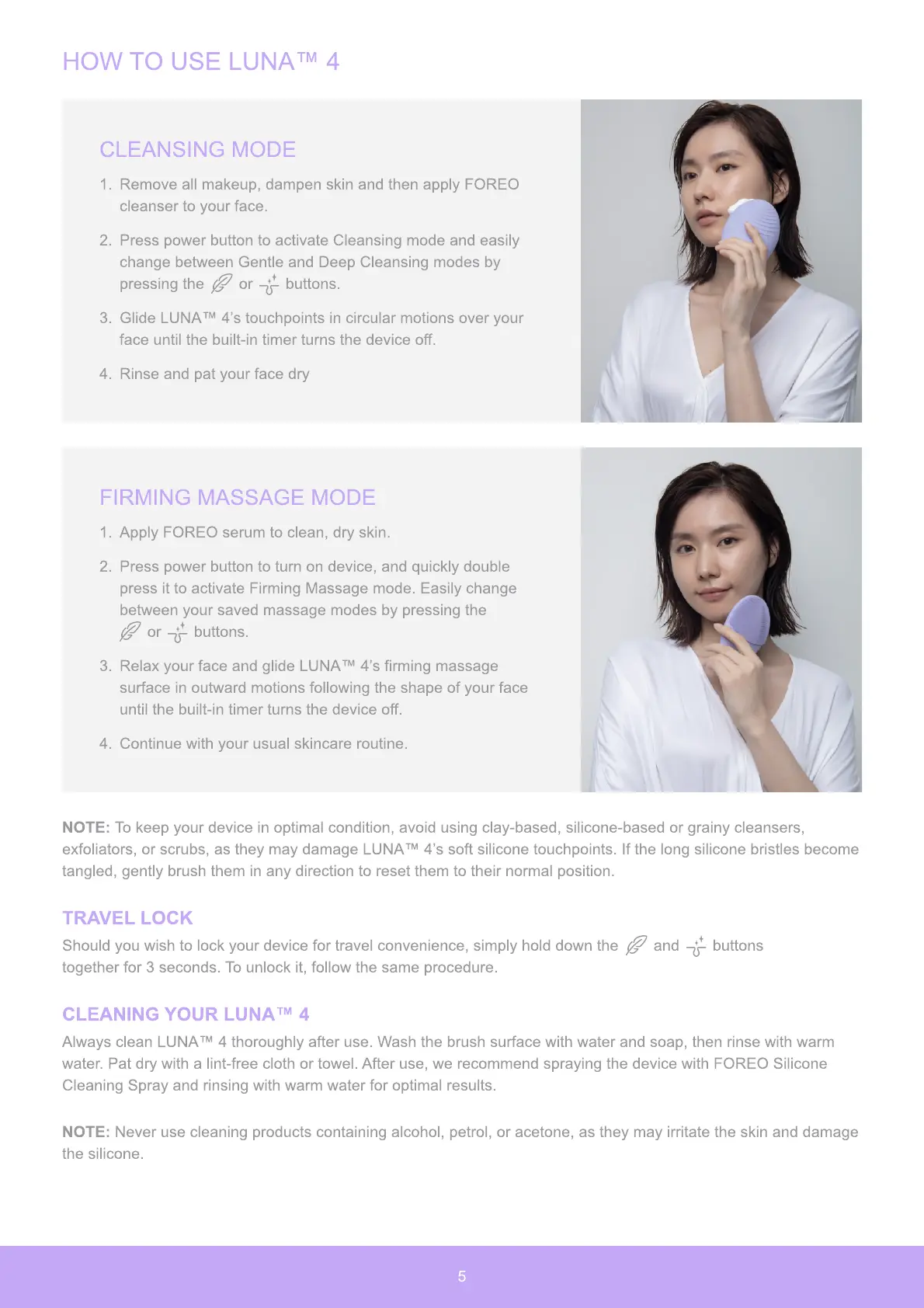 exfoliators, or scrubs, as they may damage LUNA™ 4’s soft silicone touchpoints. If the long silicone bristles become