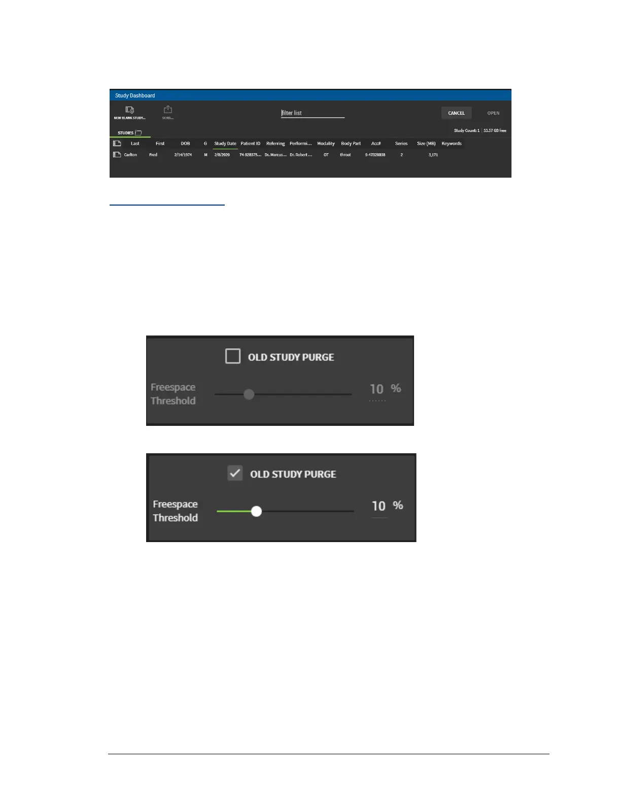 1. Click the checkbox OLD STUDY PURGE to set a free space threshold.