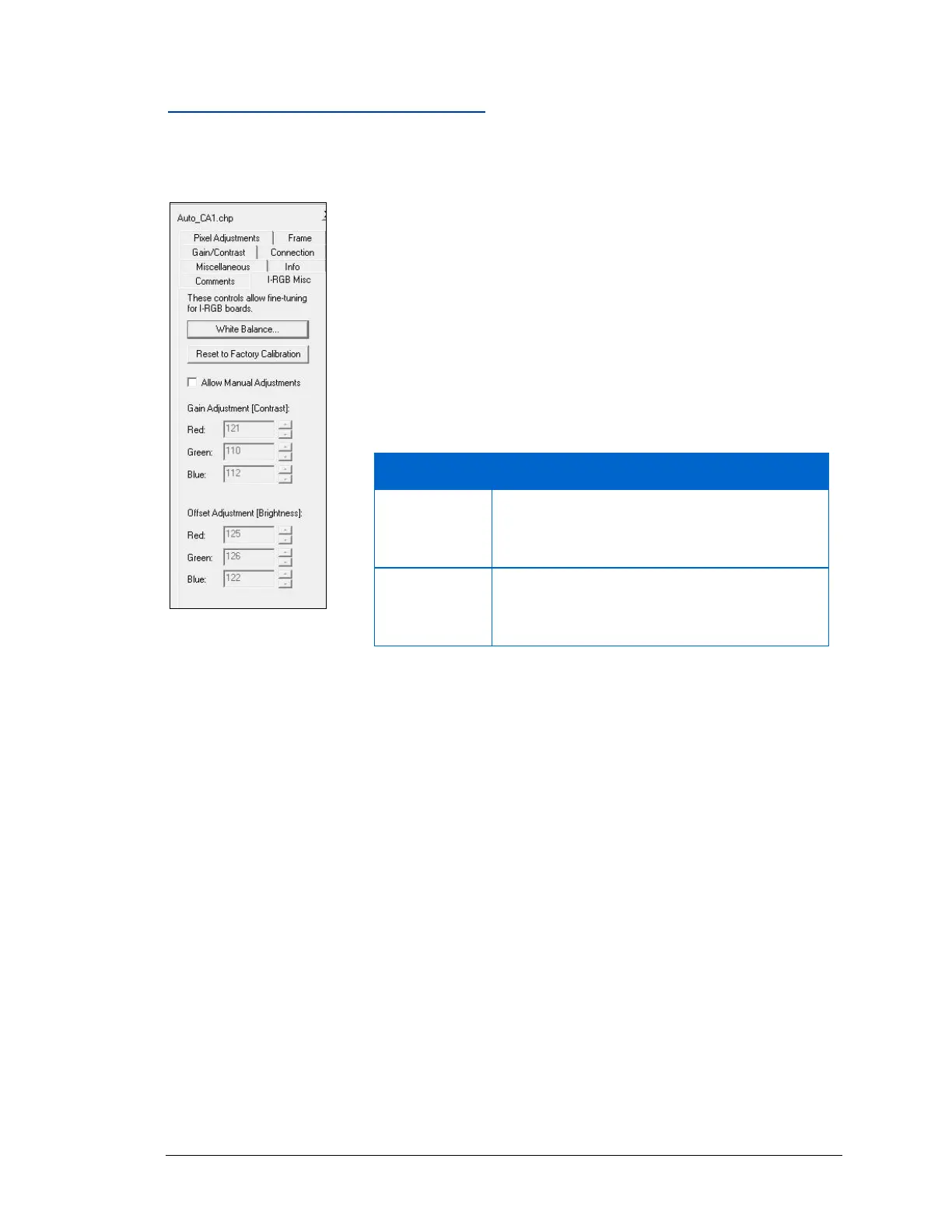 Adjustments and adjusting the gain and black level of the RGB