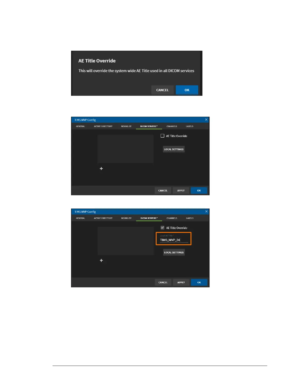 3. Click OK and the AE Title Override is selected and a Local AE Title name field opens