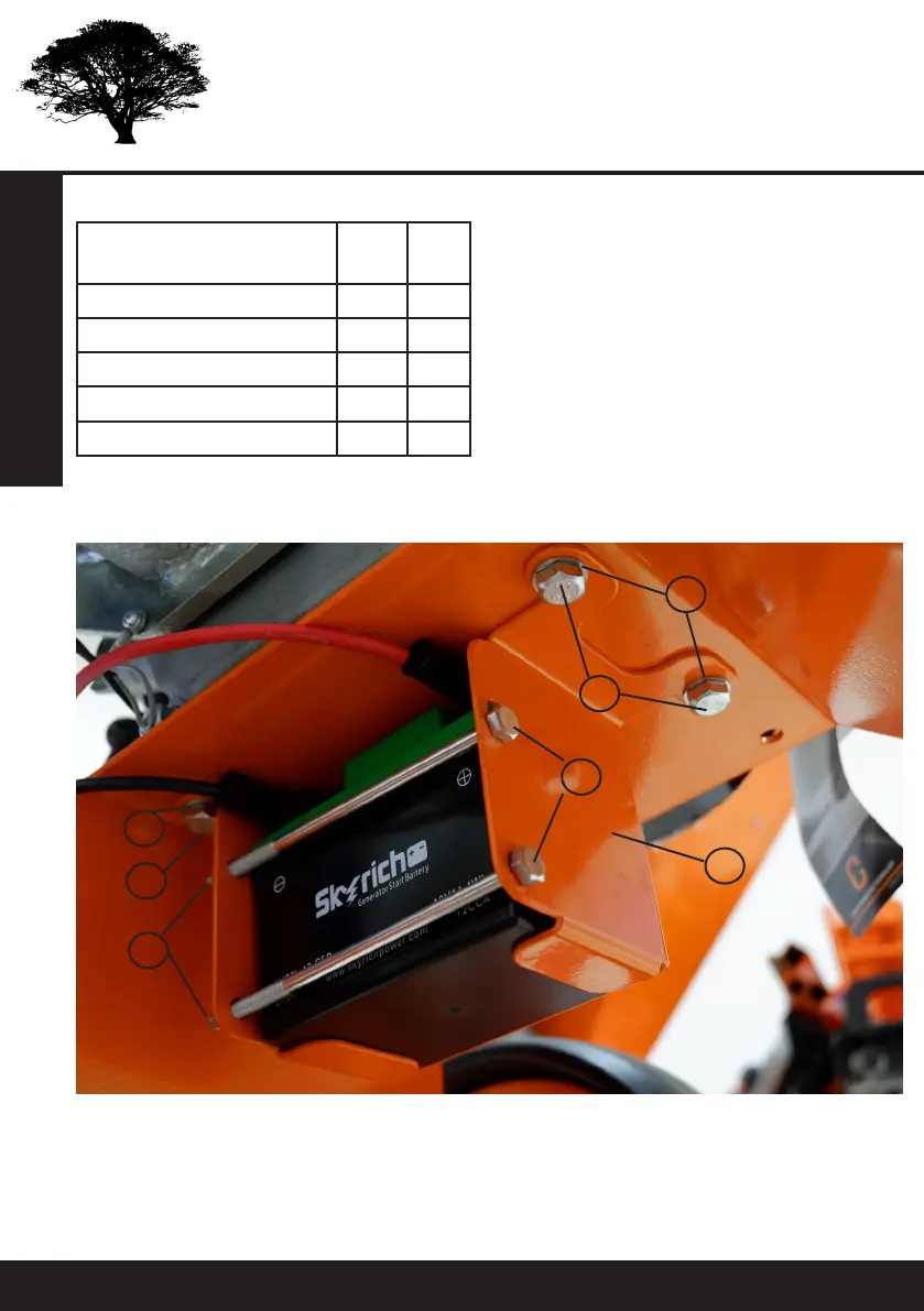 the battery on the tray and secure using the two M5 x 125 bolts (71) and nuts (72).