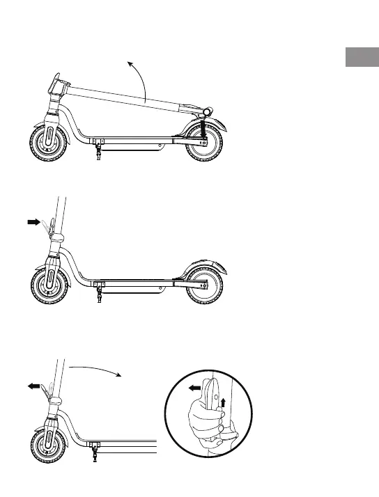 2) Right hand presses down the rear fender and left hand pulls up the long pole until folding