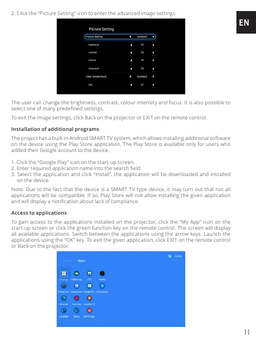 The project has a built-in Android SMART TV system, which allows installing additional software