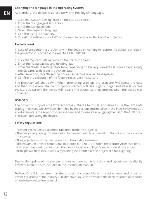 The projector supports the OTG technology. Thanks to this, it is possible to use the USB slots
