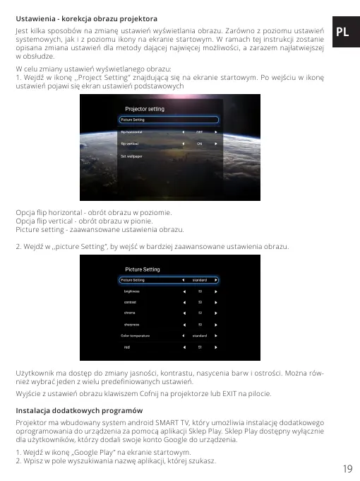 Projektor ma wbudowany system android SMART TV, który umożliwia instalację dodatkowego