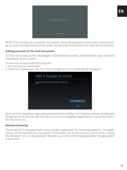 The projector is equipped with a pre-installed application for browsing websites. The appli-
