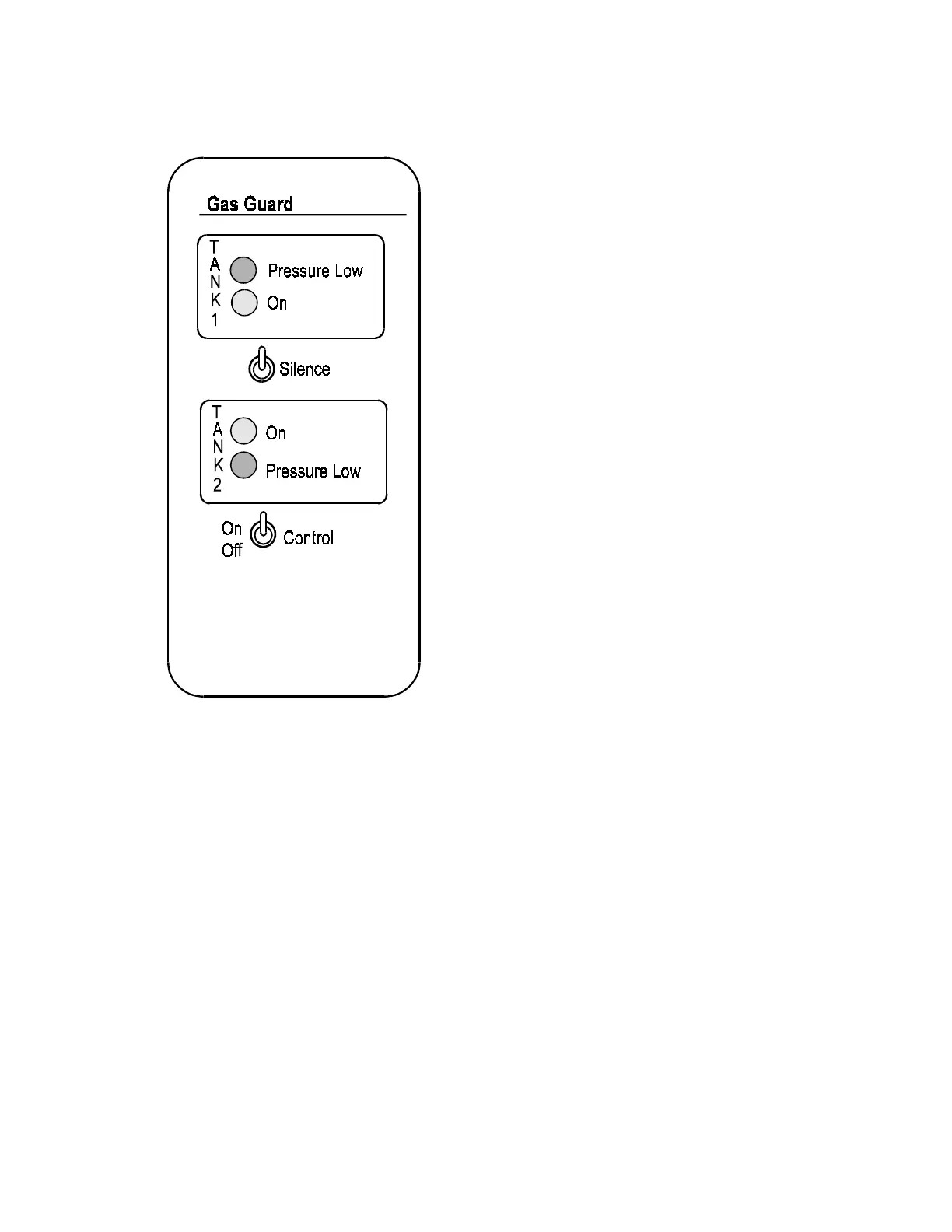 The two yellow indicating lights labeled "TANK1 On" and "TANK2 On," located on