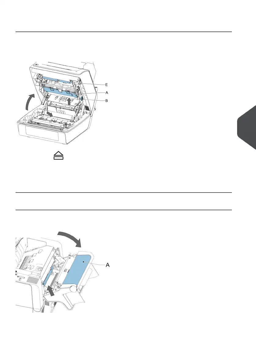 2. If necessary lift flap [A], or rotate [B] or roller [E] to transport the document.