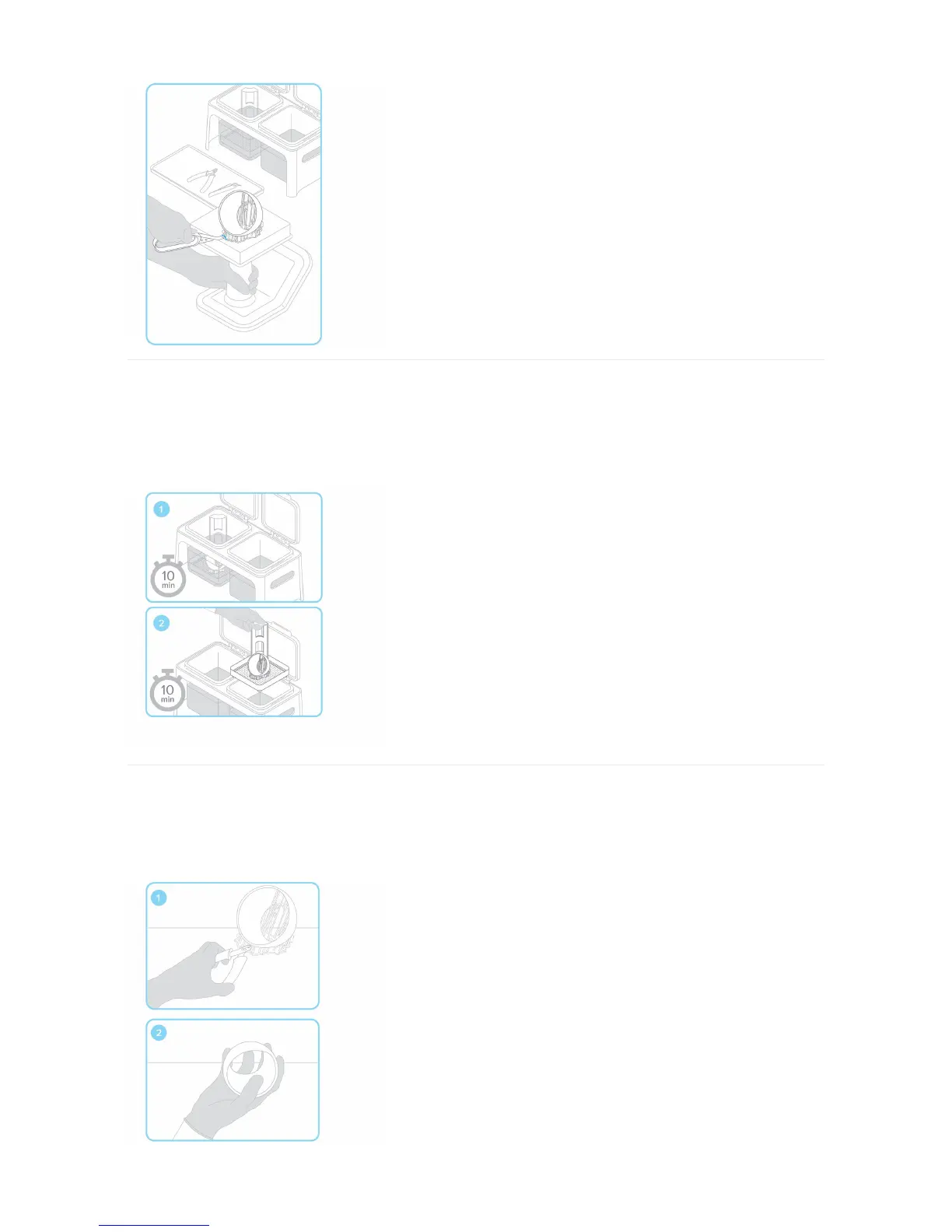 Drop your print in the rinse bucket and leave for 10 minutes. Agitate your part and repeat with the second rinse bucket. This two step process will help your IPA last longer.