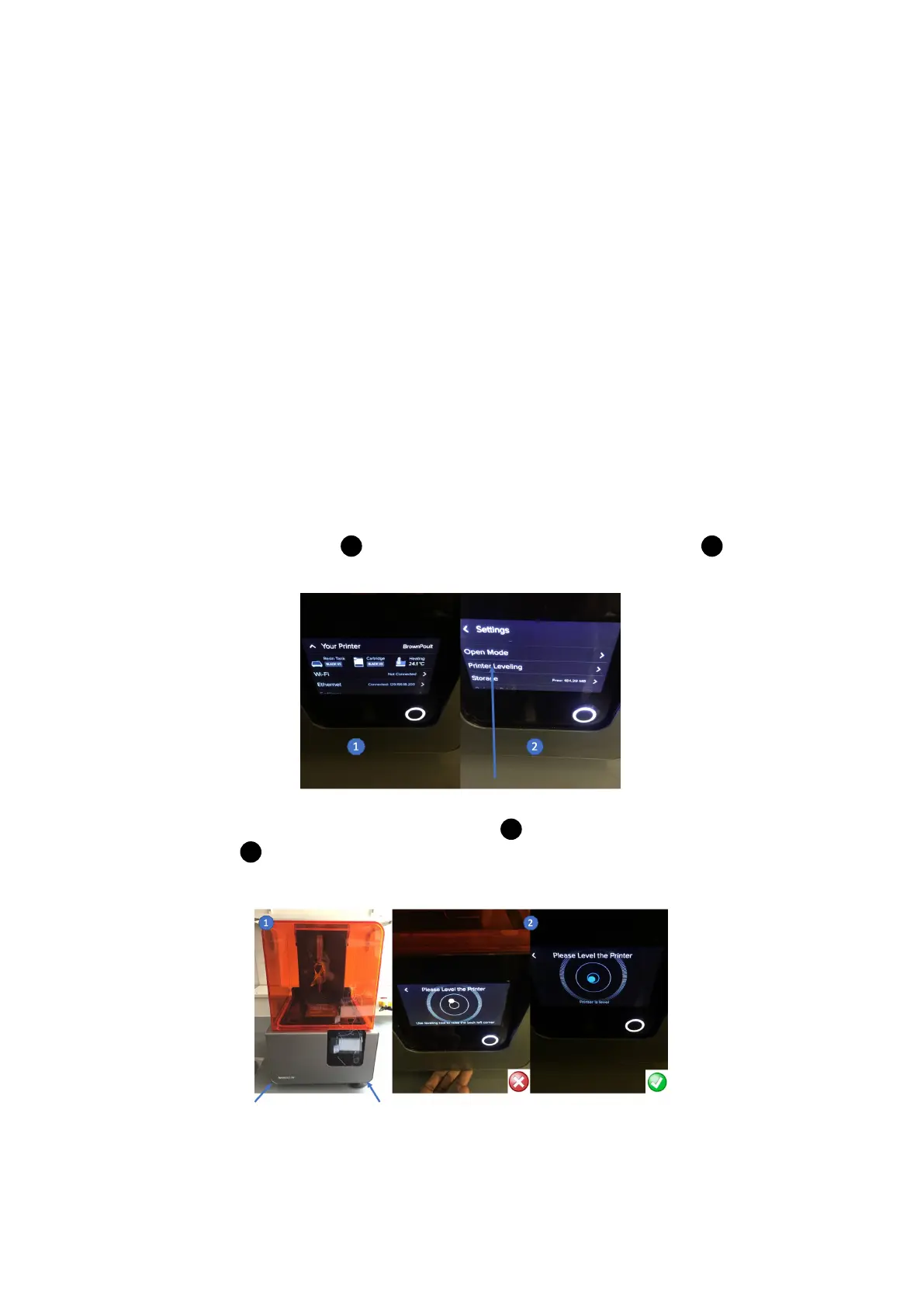 Select ”Setting” tab 1 on the touchscreen and then ”Printer leveling” tab 2 .