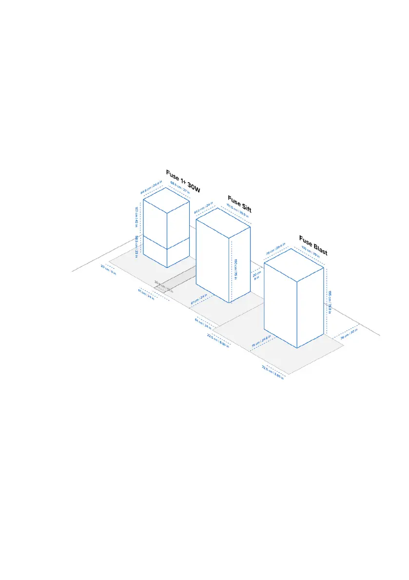 The Fuse Blast footprint is 100 × 75 × 175 cm (39 × 29.6 × 68.7 in). With the blasting