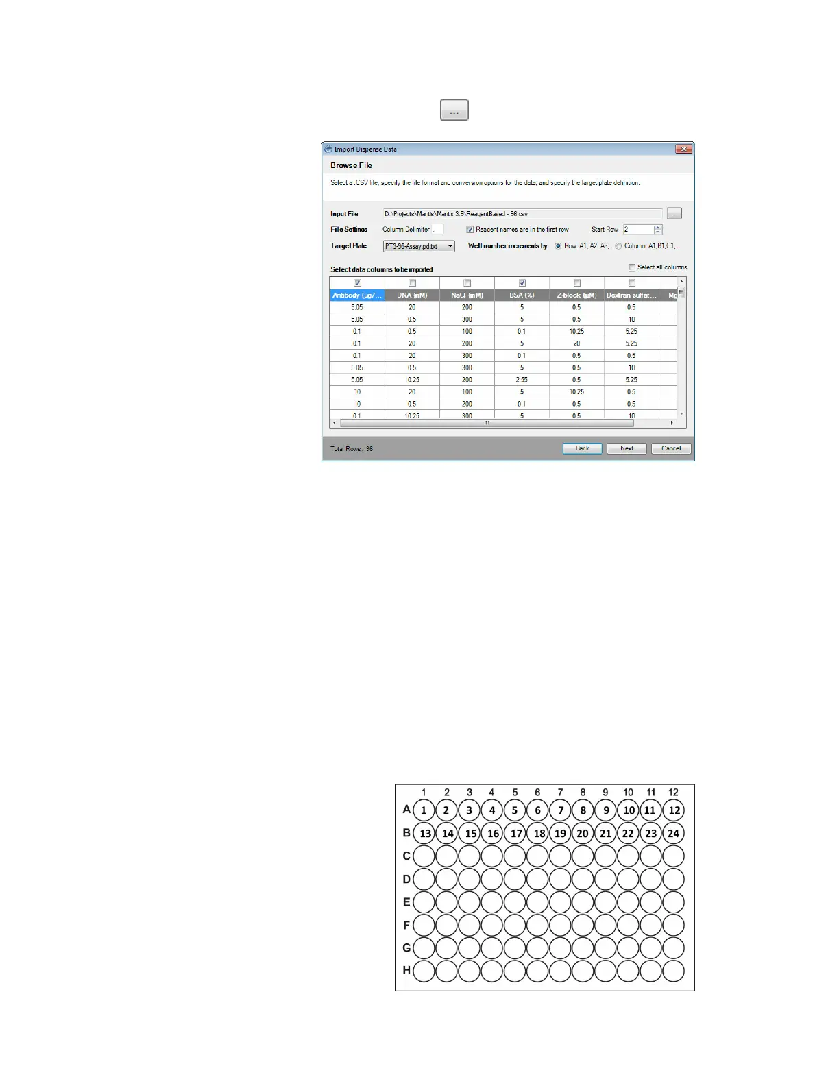 your .CSV file. Wells B1 through B12 are numbered 13 to 24 and so on.