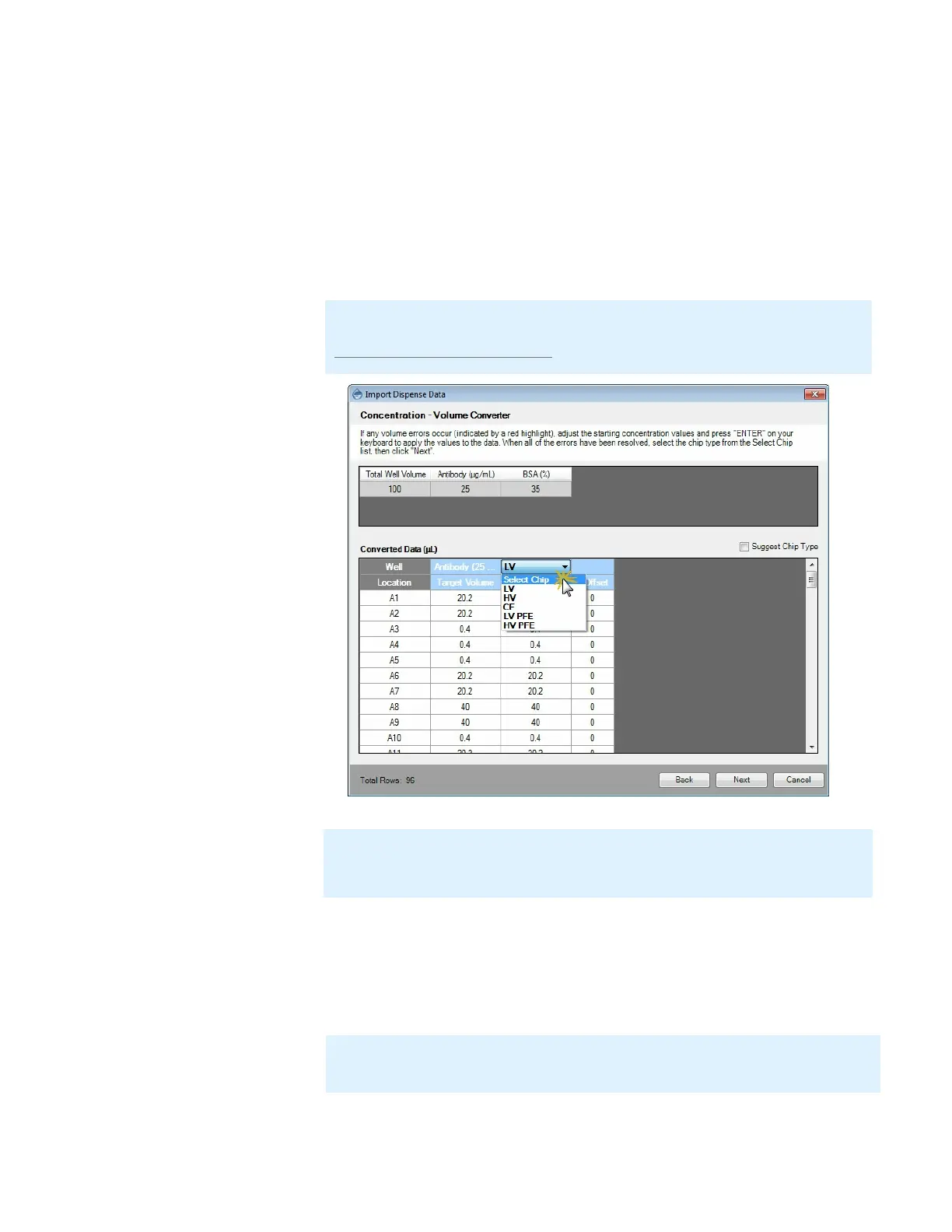 Converted Data (μL) panel, which enables MANTIS to suggest a chip type for each