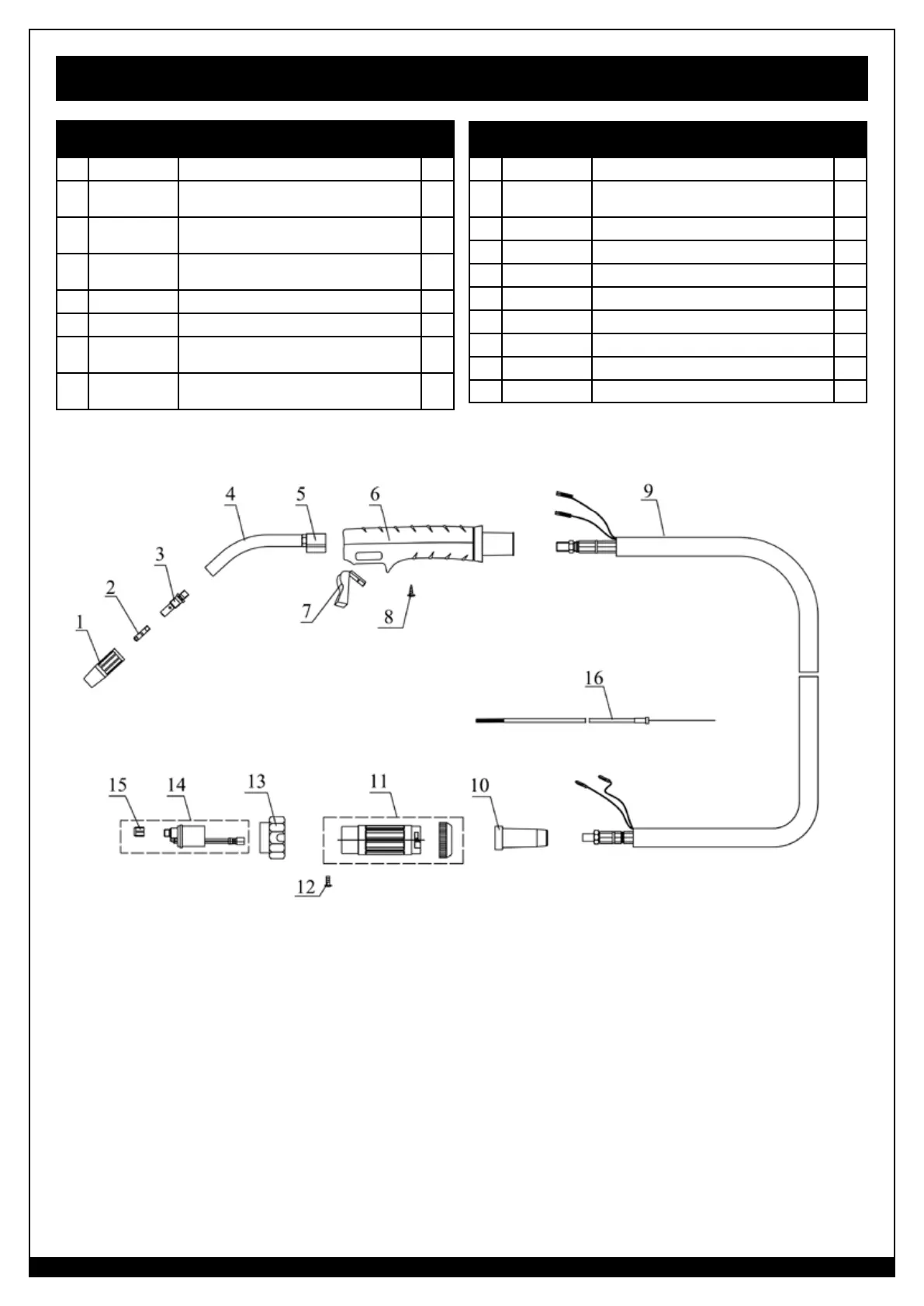 Liste des pièces de rechange du chalumeau du pistolet MIG