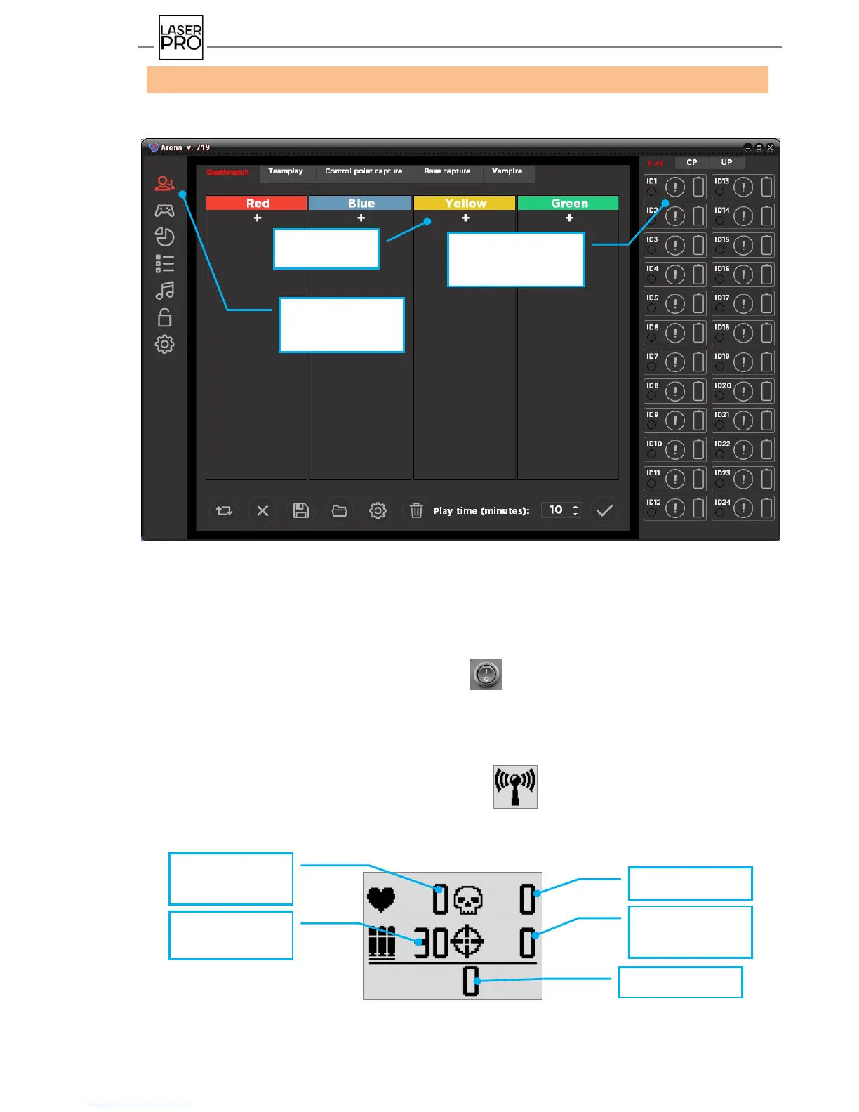 vest and blaster start blinking by a color selected for this kit, blaster loud speaker announces
