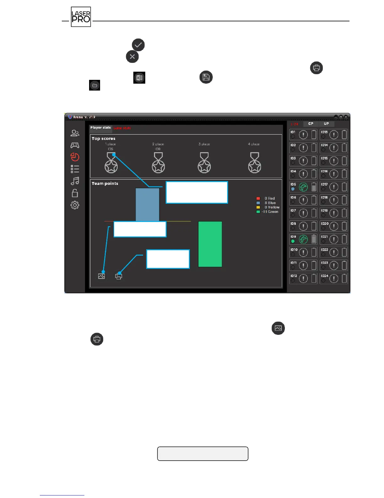 Players' game stats is possible to print on the printer connected to PC (button ),