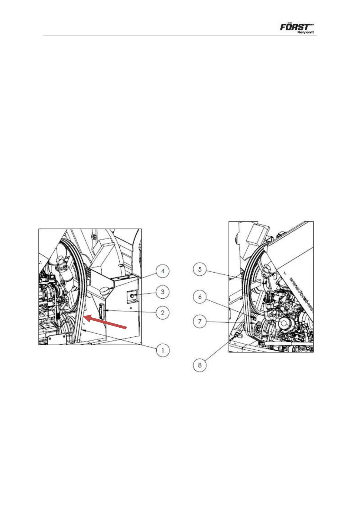 2. Turn adjuster nut (8) to tension belt until 4.5Kg force at the belt longest centre