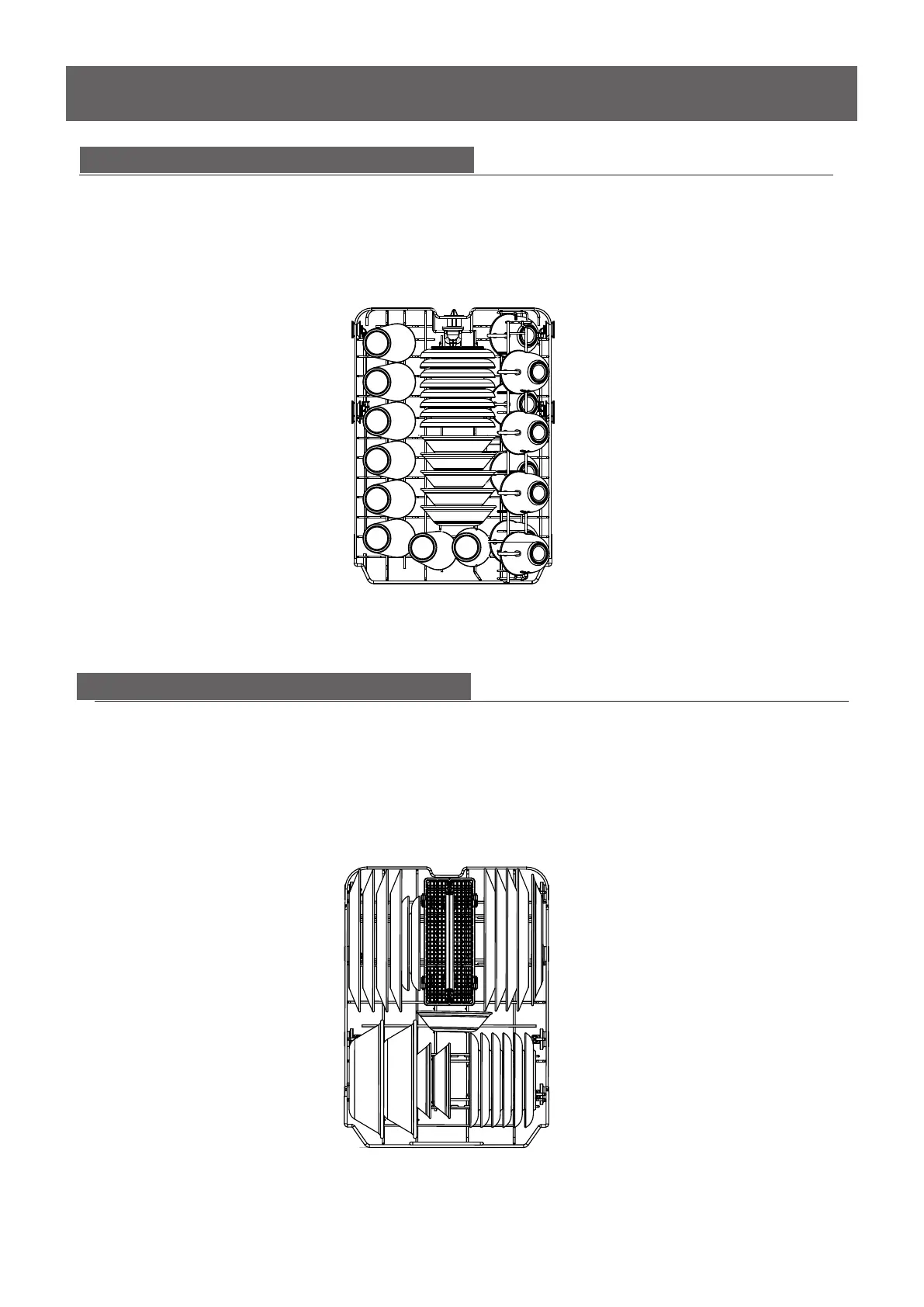 The upper basket has been designed for small plates, mugs, glasses, and plastic items marked “dishwasher