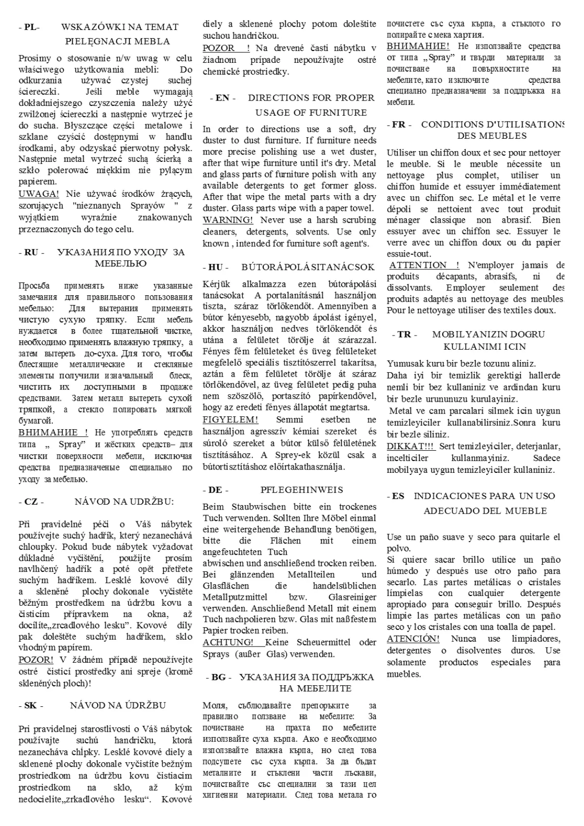 Forte Ohio - Furniture Care and Maintenance; Warning Against Harsh Cleaners