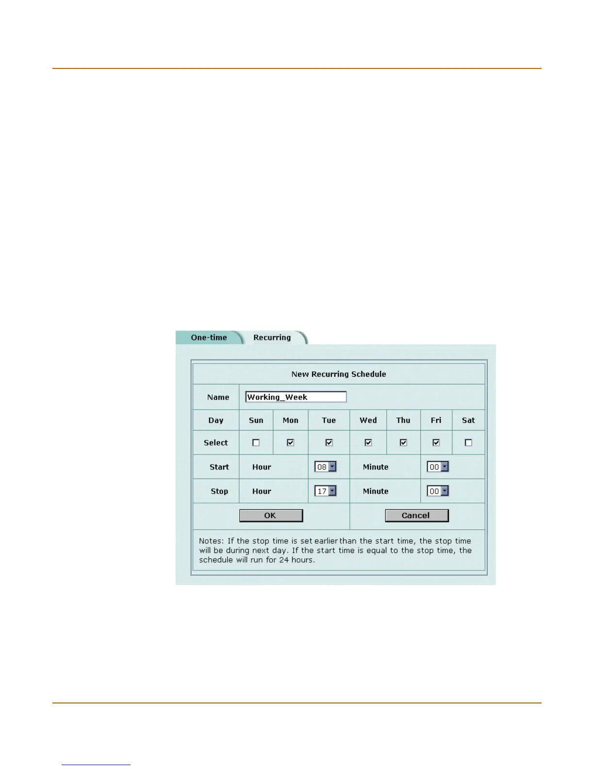 If you create a recurring schedule with a stop time that occurs before the start time,