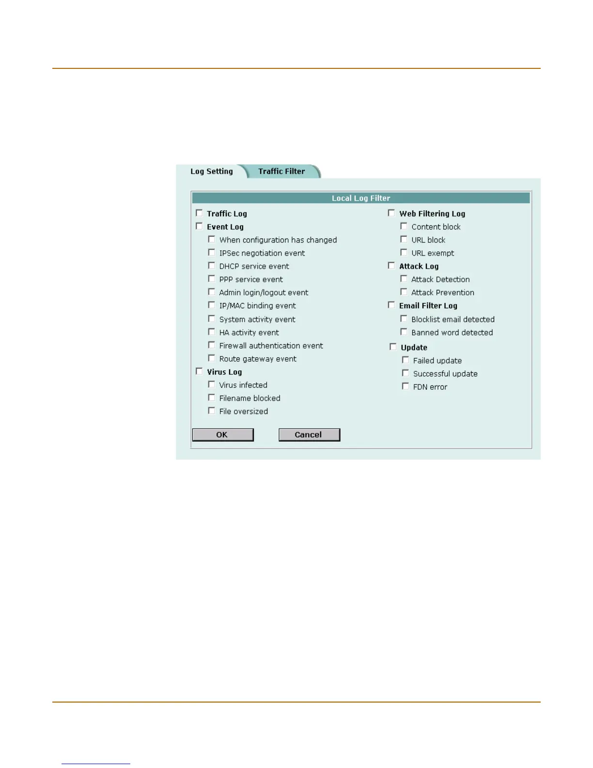 selected Event Log, Virus Log, Web Filtering Log, Attack Log, Email Filter Log, or