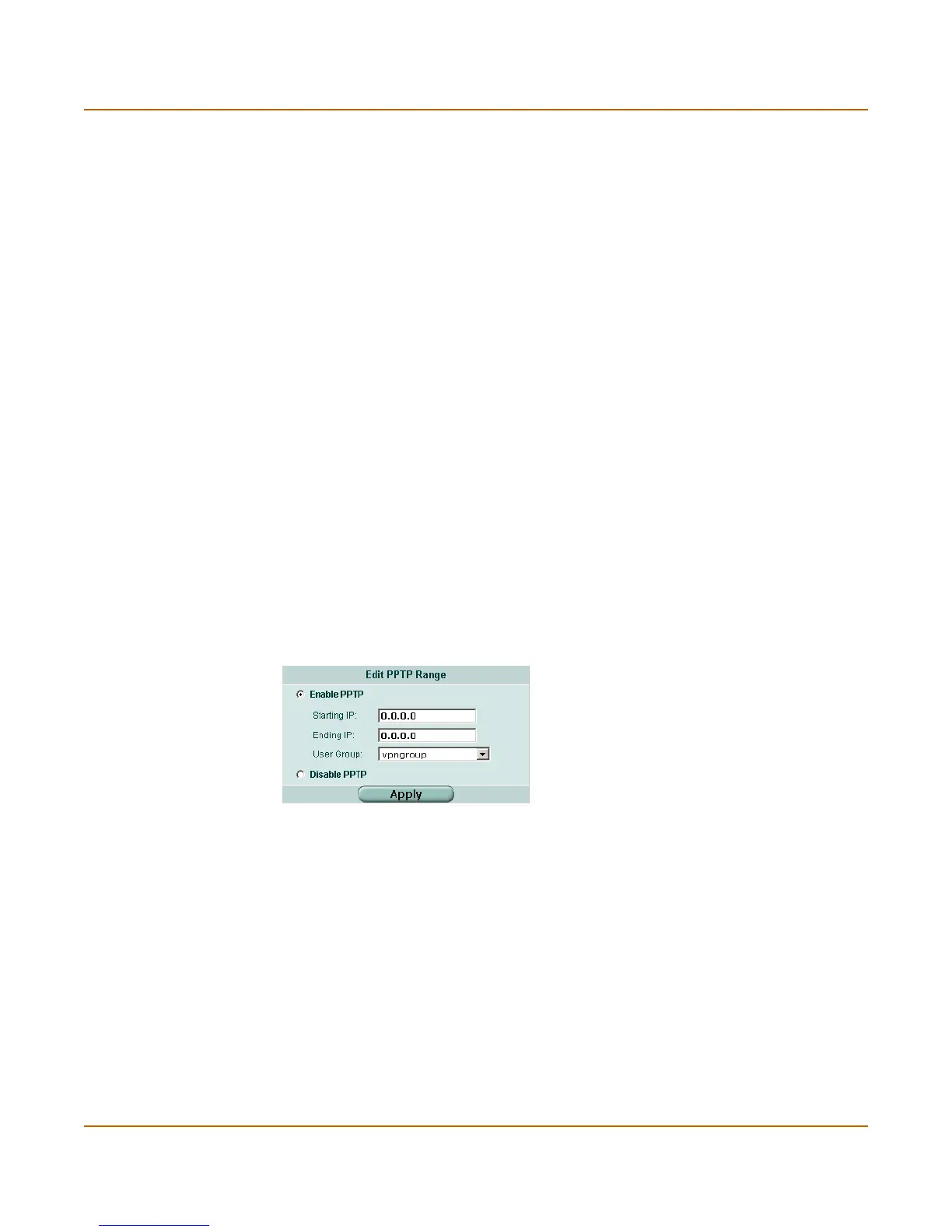User Group Select the user group that contains the remote PPTP VPN clients.