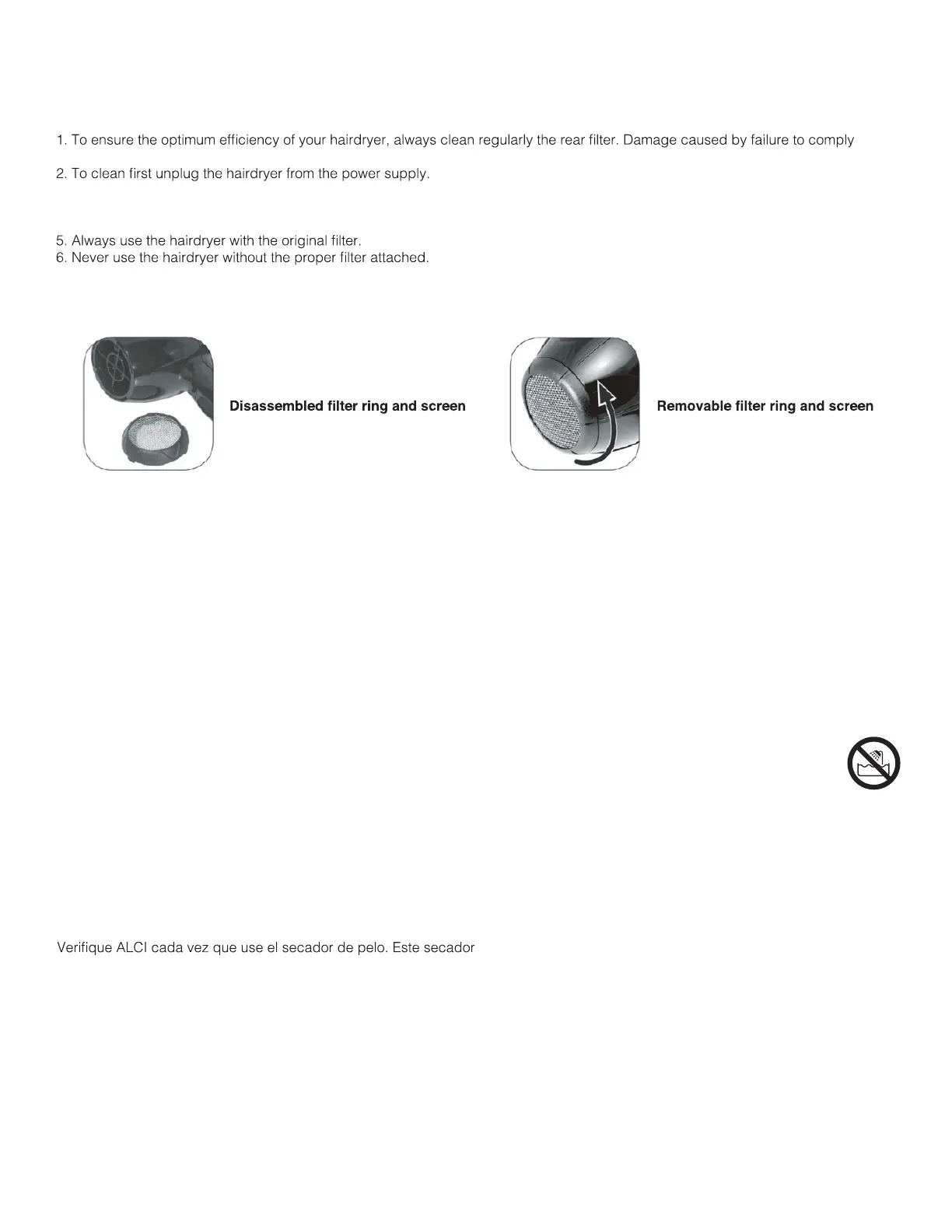 4. Wipe the outside of the hairdryer with a damp cloth. Do not use sharp or abrasive detergents or corrosive products or steam