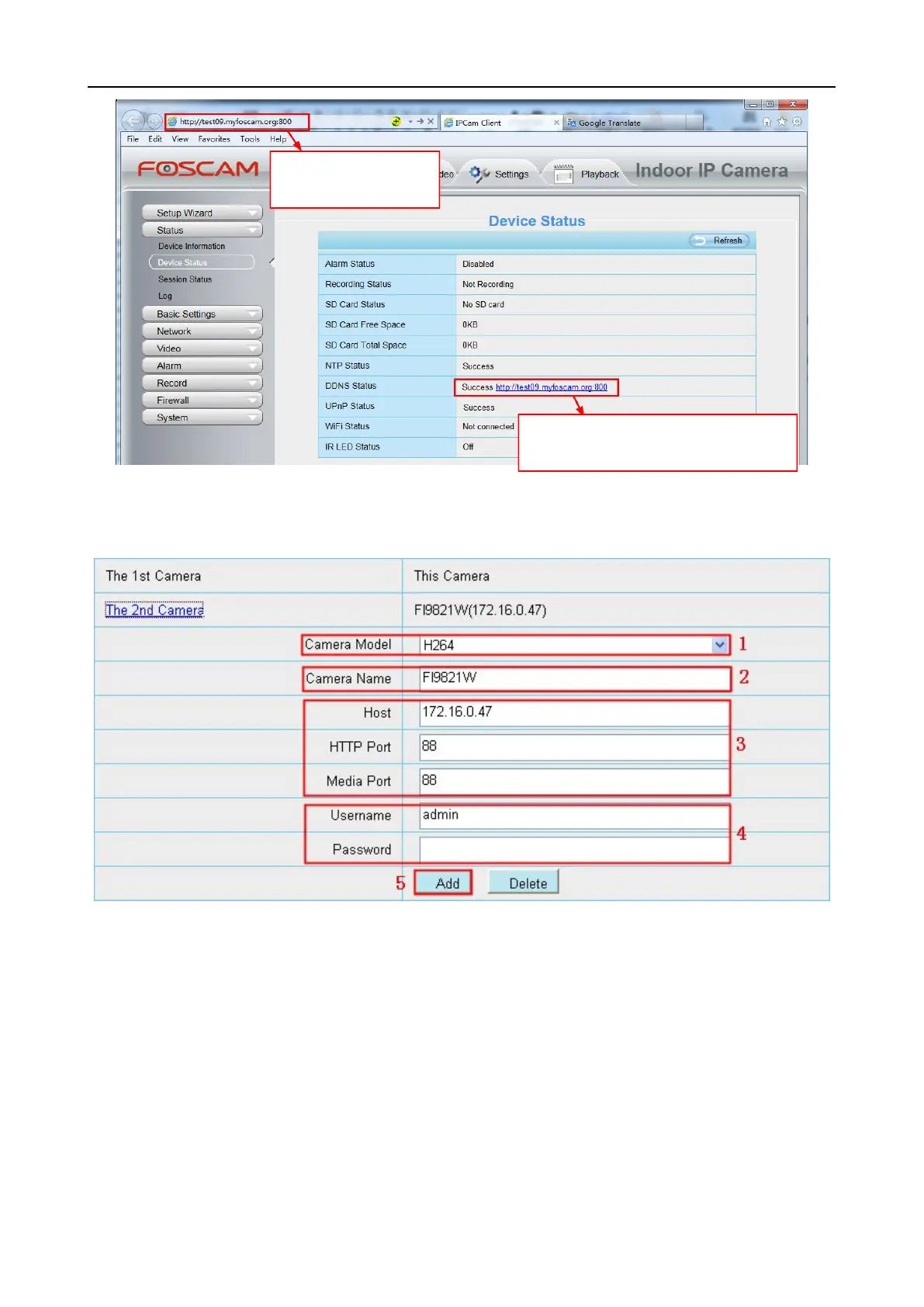 NOTE: Here the Host must be entered as the second camera’s DDNS domain name, not its LAN IP.