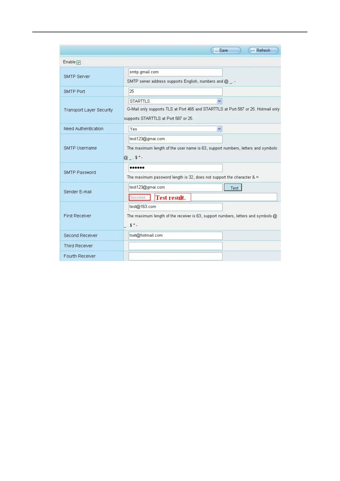 If the test success, you can see the Success behind the Test, at the same time the receivers will receive
