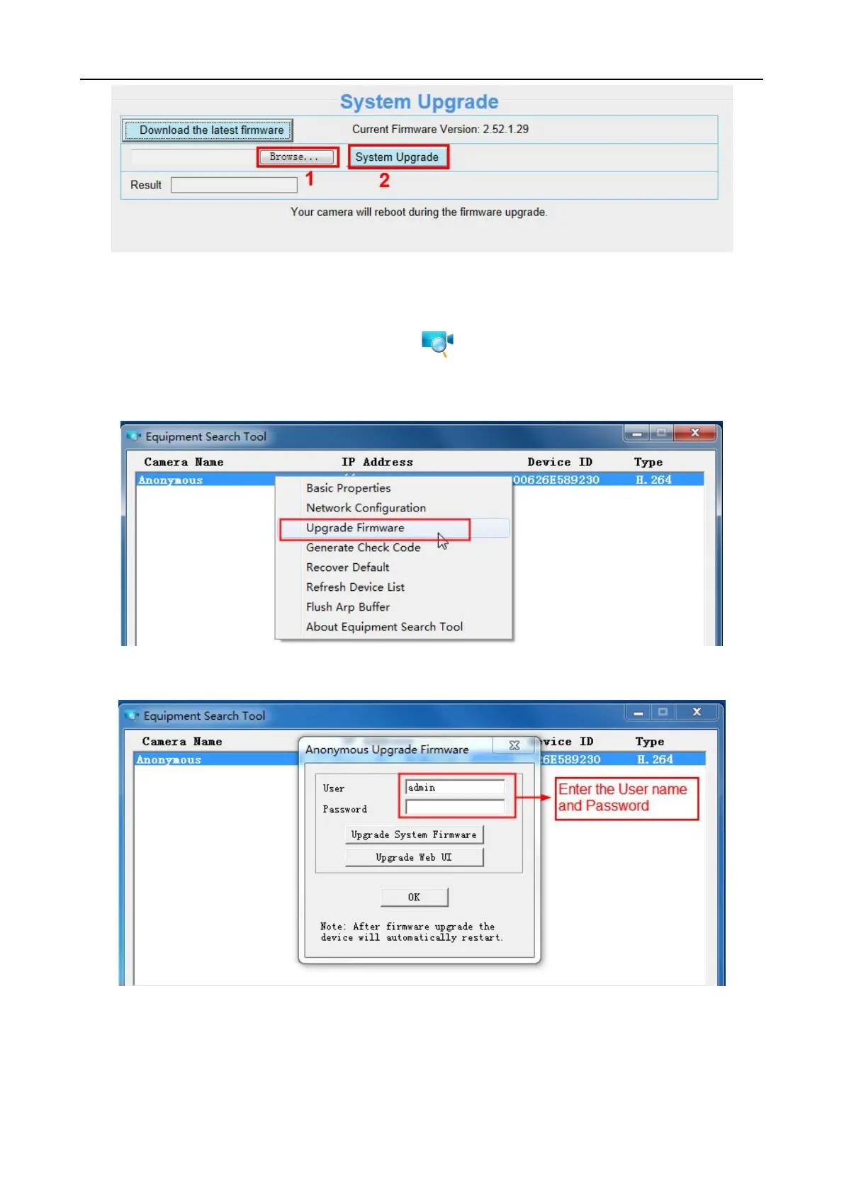 upgrade the firmware. Then select Upgrade Firmware and enter the username and password, choose
