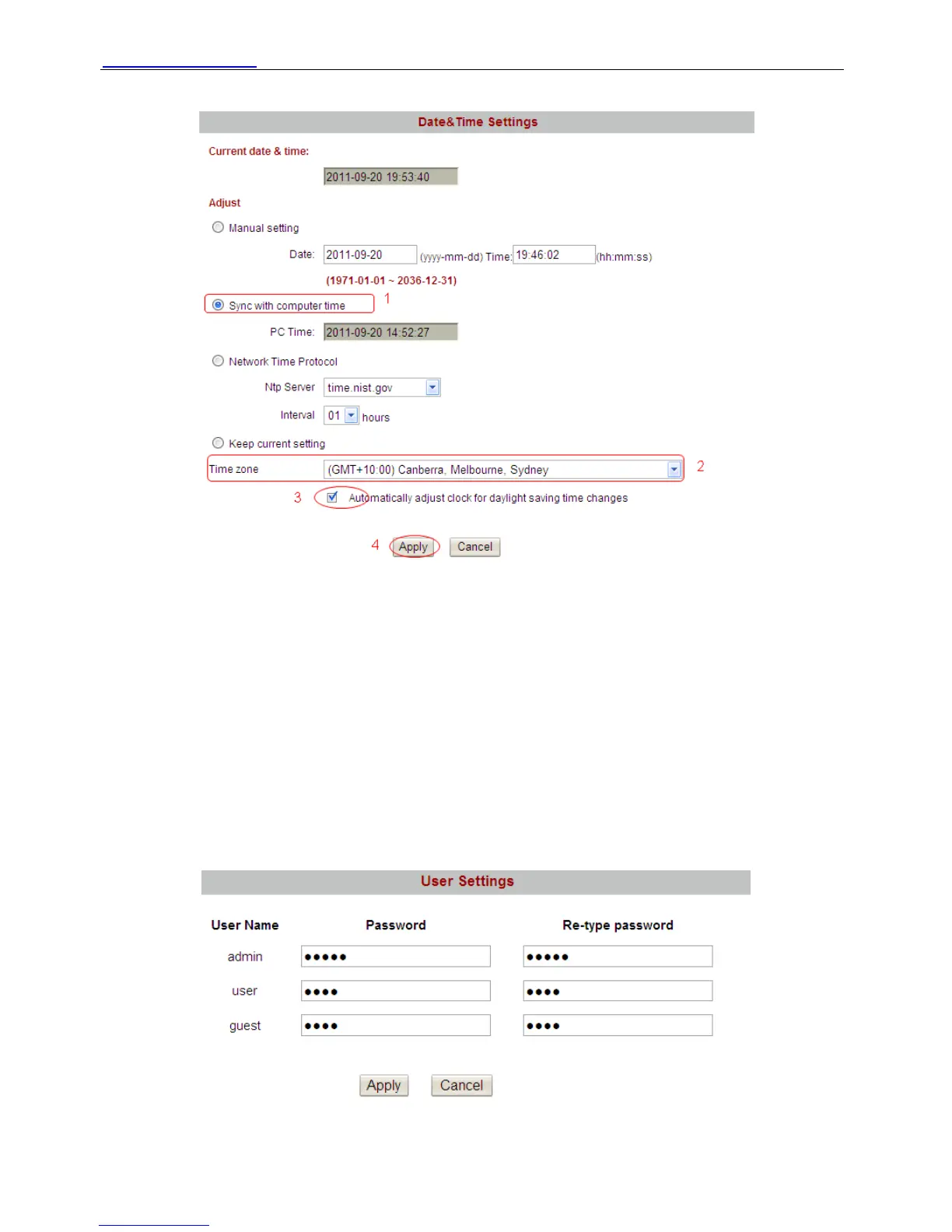 The camera has set up 3-level user permissions, user names are admin, user, guest, and the