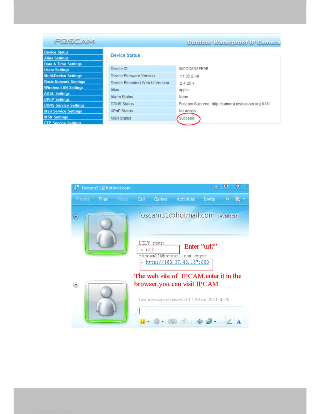 Note: Create a new MSN account for the camera, do not use the same MSN account as you