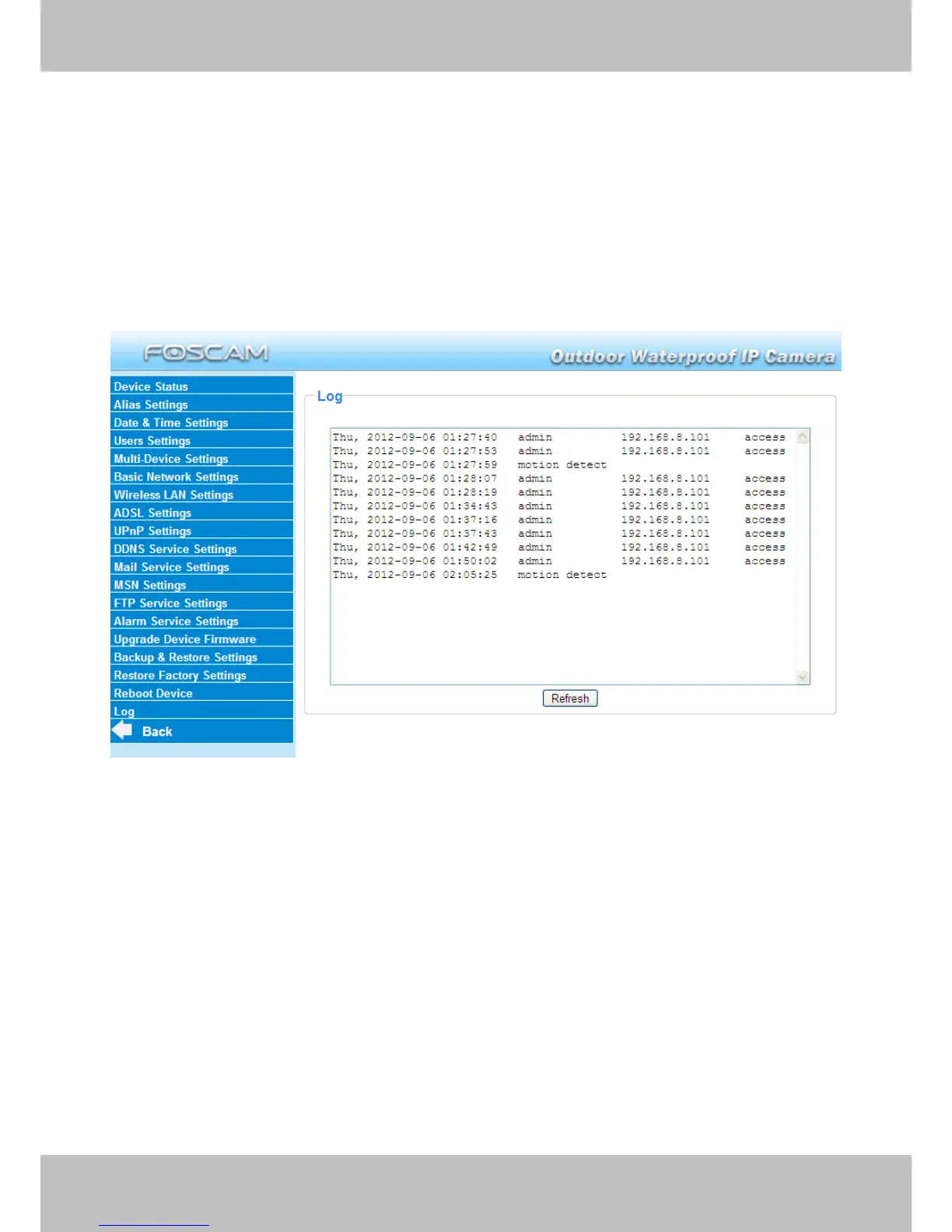 Foscam FI8905E - Reboot Device; Log; Back