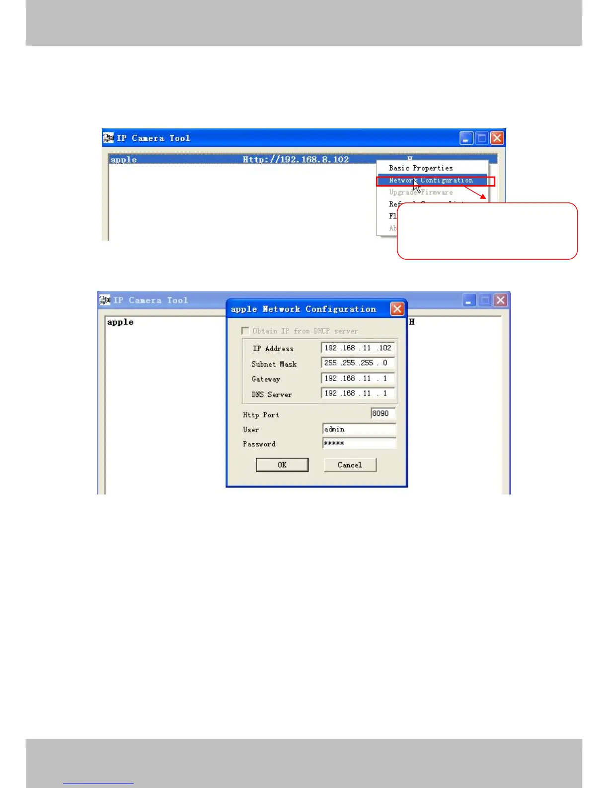 Open the IP Camera Tool, select the camera you want to change the port no, right click on the IP