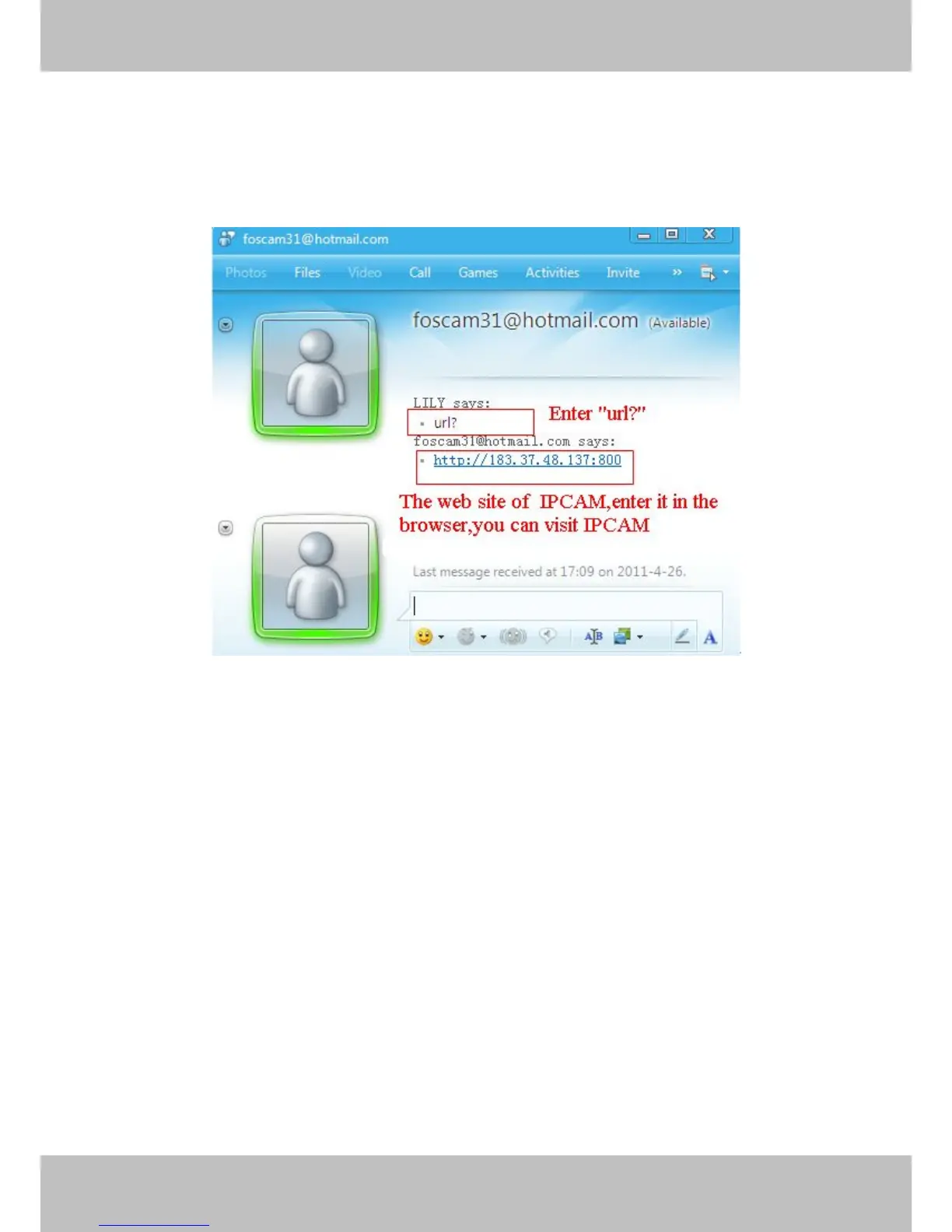 Foscam13(this account contained in the Friends list) log in MSN, and double click the camera’s