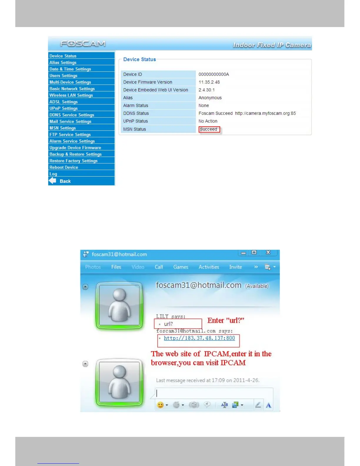 Foscam13(this account contained in the Friends list) log in MSN, and double click the camera’s