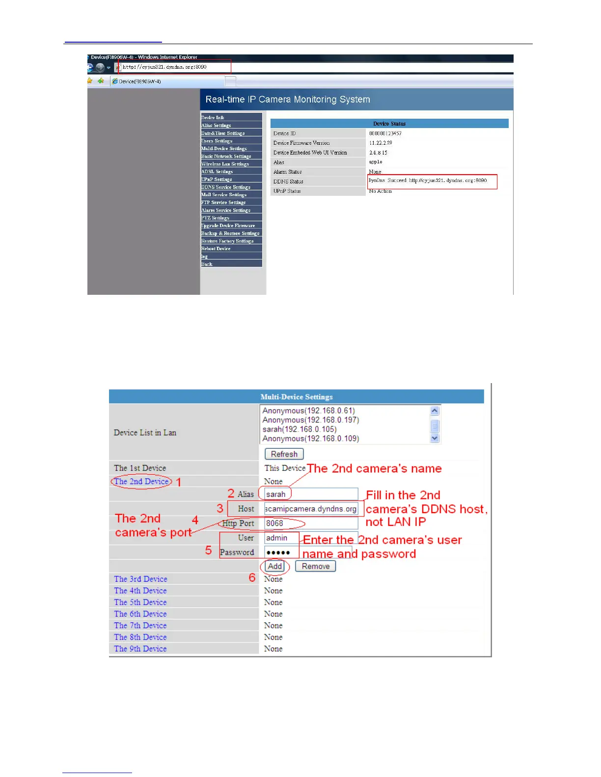 Click Multi-Device Settings. Choose The 2nd Device. Fill in the 2nd camera’s name, DDNS