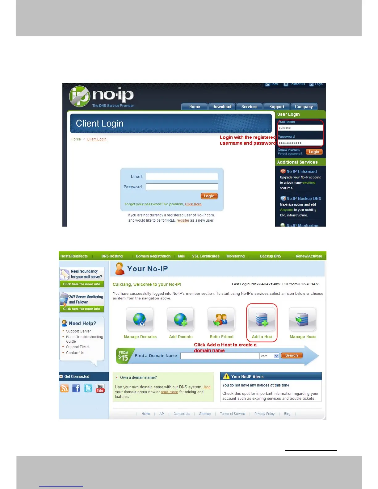 Please create the domain name step by step according to instructions on www.no-ip.com