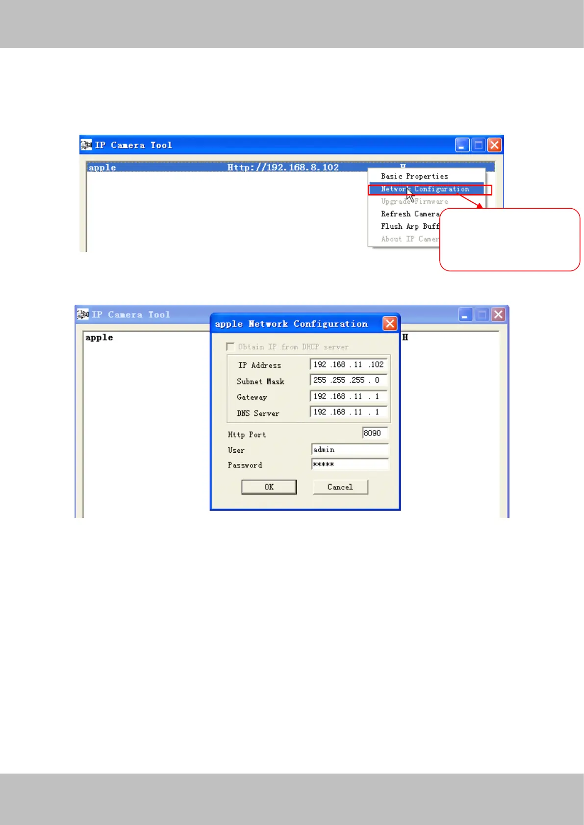 O pen the IP Camera T ool, select the camera you want to change the port no , right click on the IP