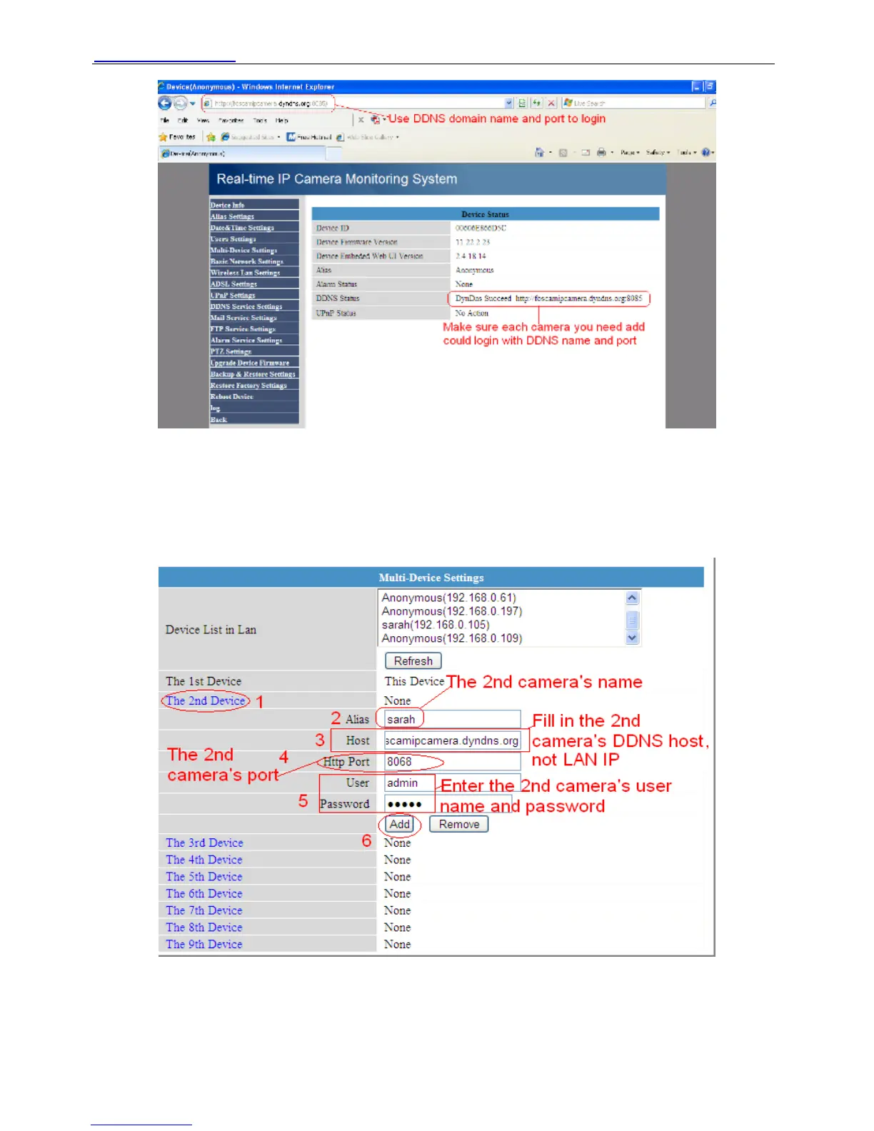 Click Multi-Device Settings. Choose The 2nd Device. Fill in the 2nd camera’s name, DDNS