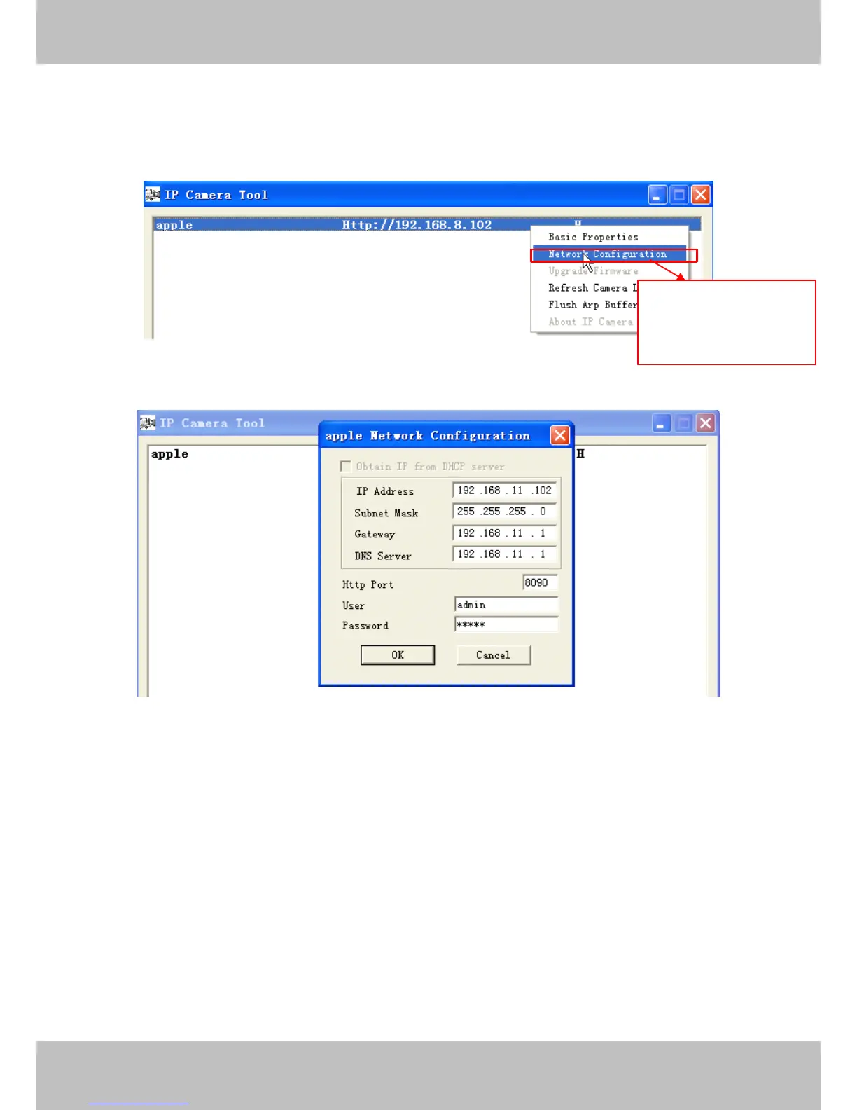 O pen the IP Camera T ool, select the camera you want to change the port no , right click on the IP