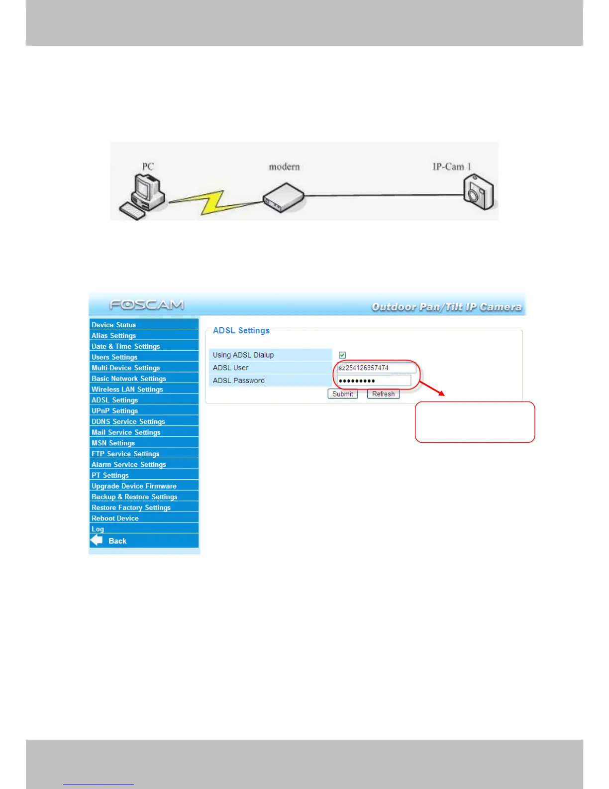 ADSL account &password provided by the ISP, then make the camera connected to the network.