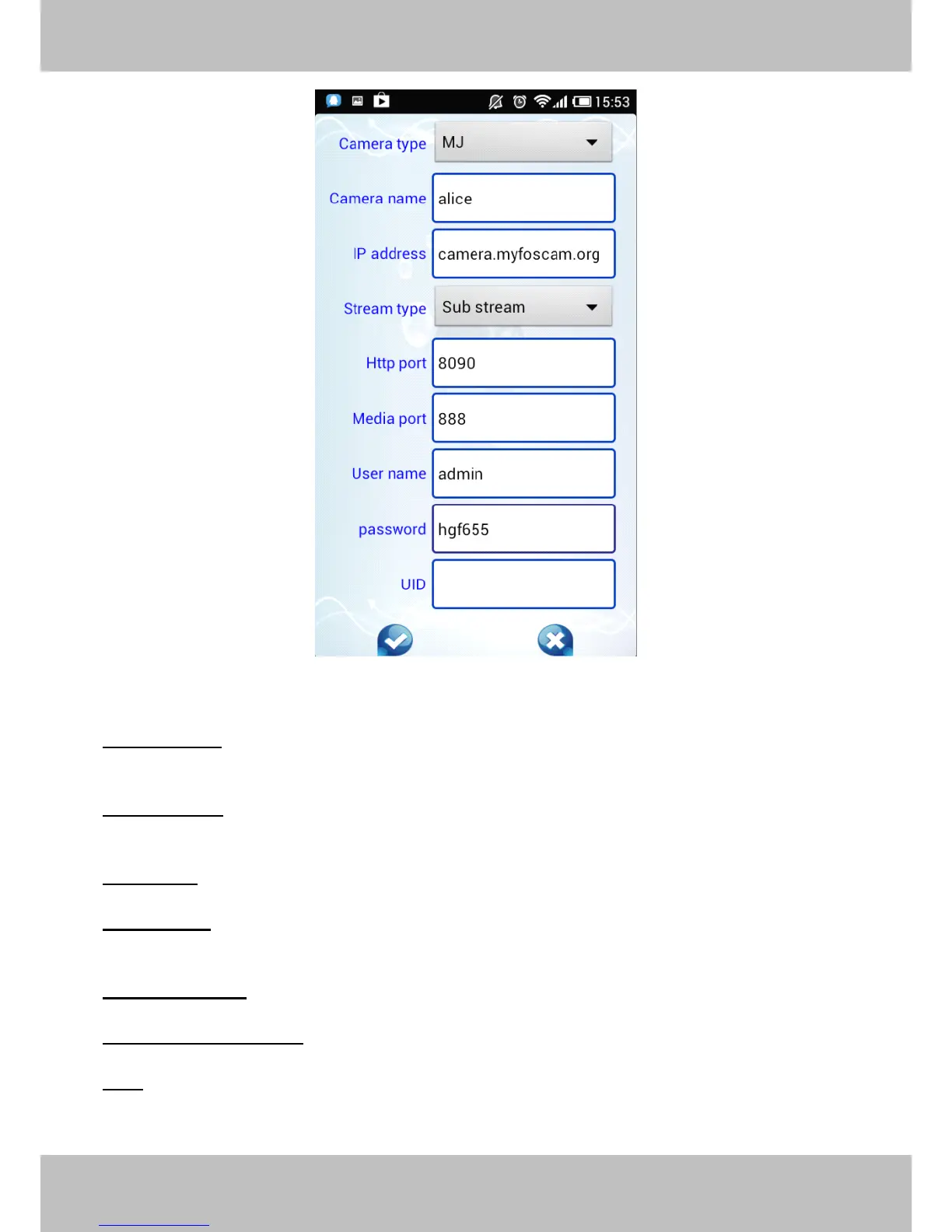 UID: If your camera supports UID, here you may fill in the UID no.. Now FOSCAM camera does