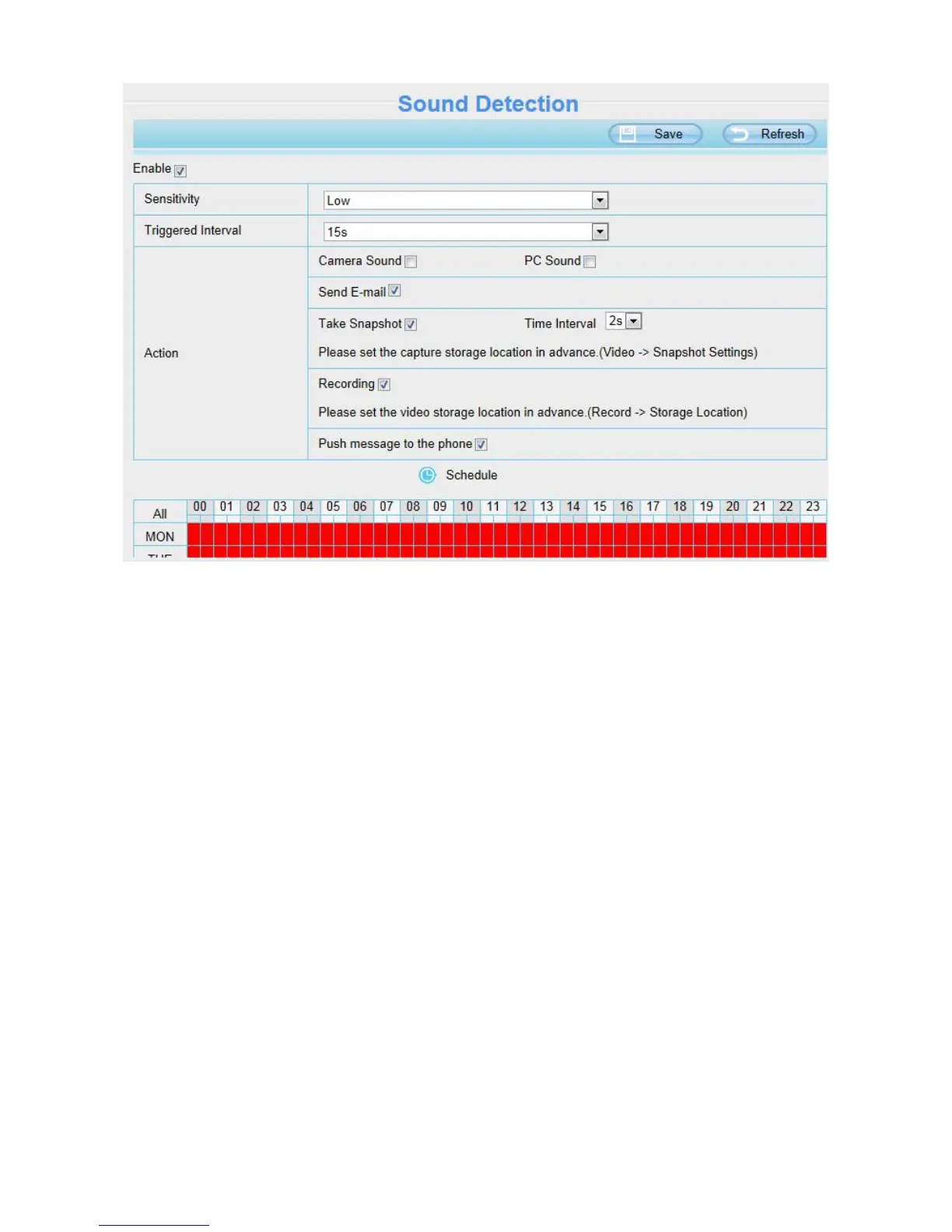 If the Sensitivity is set to Lower, the camera will detect the sound whose more than 85db.