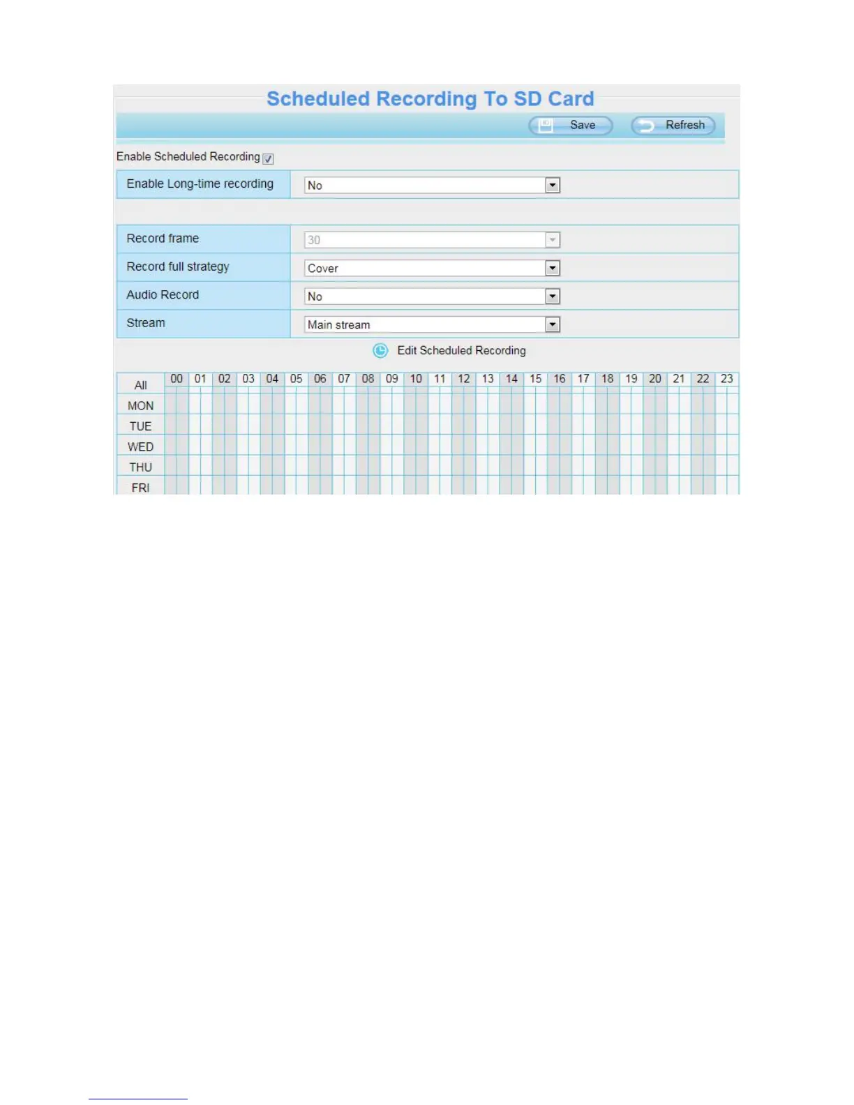 Scheduled recording only supports video saved to the SD card or FTP server.